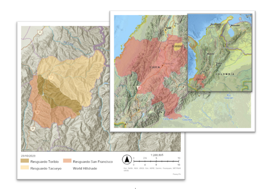 En la Figura 1 se ilustra la ubicación del departamento del Cauca en el suroccidente de Colombia, específicamente en la zona norte de la cordillera de los Andes. Por su parte, el municipio de Toribío se sitúa en la región norte de este departamento, sobre su flanco occidental y se divide en tres resguardos indígenas.