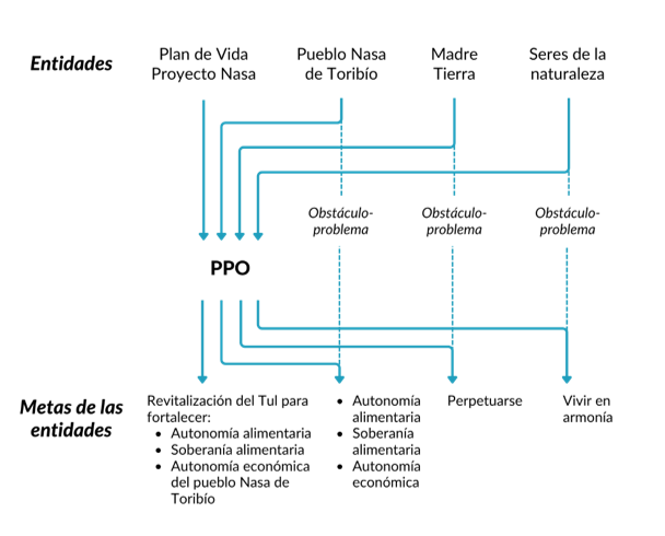 Sin embargo, se debe tener claro que los actores previamente enrolados, están inmersos tentativamente en las problematizaciones de otros actores, quienes pueden tener agencia sobre ellos y representan un obstáculo-problema para la estabilización del Tul Nasa como PPO, como se muestra en la Figura 5. Por lo tanto, pueden adherirse en el plan inicial o negarse y definir su identidad, motivaciones, intereses, sus sueños o proyectos de otro modo. Para mantener el plan inicial, el actor (Plan de Vida) debe emprender una serie de acciones para mantener interesados a los otros actores, es decir, acciones que impongan y estabilicen la identidad de los actores definida en la problematización denominados mecanismos de interesamiento (Callon, 1995).