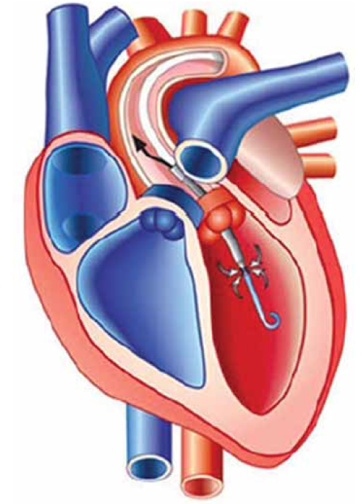 Se trata de un sistema de flujo axial sobre un catéter, el cual se posiciona a través de la válvula aórtica (Figura 2). El flujo de entrada está localizado en el interior del VI y el de salida en la aorta. De esta manera desprecarga al ventrículo proporcionando un flujo no pulsátil a la aorta ascendente. Existen diversos tipos de Impella: 2.5