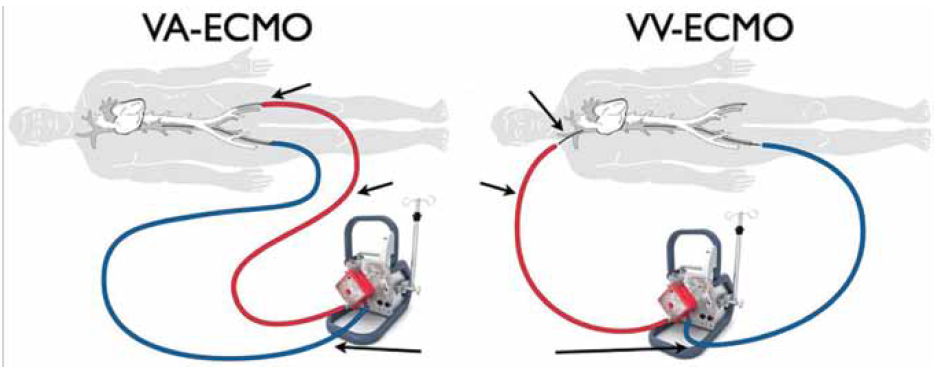 Si la sangre es extraída desde una vena central y devuelta al sistema venoso, el proceso es denominado ECMO veno-venoso (ECMO-VV); mientras que si la sangre es extraída desde el sistema venoso y devuelta al sistema arterial, esto se denomina ECMO veno-arterial (ECMO-VA). El primer caso provee un soporte respiratorio, únicamente; mientras que el segundo es utilizado para soporte cardio-respiratorio y es utilizado en situaciones como el shock cardiogénico (Figura 4). Sus complicaciones más frecuentes son: hemorragias mayores, accidente