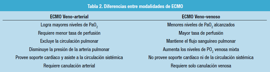Si la sangre es extraída desde una vena central y devuelta al sistema venoso, el proceso es denominado ECMO veno-venoso (ECMO-VV); mientras que si la sangre es extraída desde el sistema venoso y devuelta al sistema arterial, esto se denomina ECMO veno-arterial (ECMO-VA). El primer caso provee un soporte respiratorio, únicamente; mientras que el segundo es utilizado para soporte cardio-respiratorio y es utilizado en situaciones como el shock cardiogénico (Figura 4). Sus complicaciones más frecuentes son: hemorragias mayores, accidentecerebrovascular, fenómenos embólicos, infecciones y disfunción multiorgánica (Tabla 2):