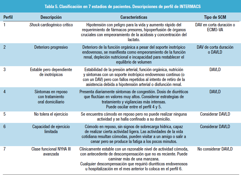 Los pacientes candidatos a SCM son aquellos con IC avanzada definida previamente. Esta definición abarca un espectro amplio de pacientes con diferentes presentaciones clínicas, gravedad y pronóstico, es por ello que el grupo INTERMACS ha desarrollado una clasificación en 7 estadios para subclasificar a estos pacientes (Tabla 5).