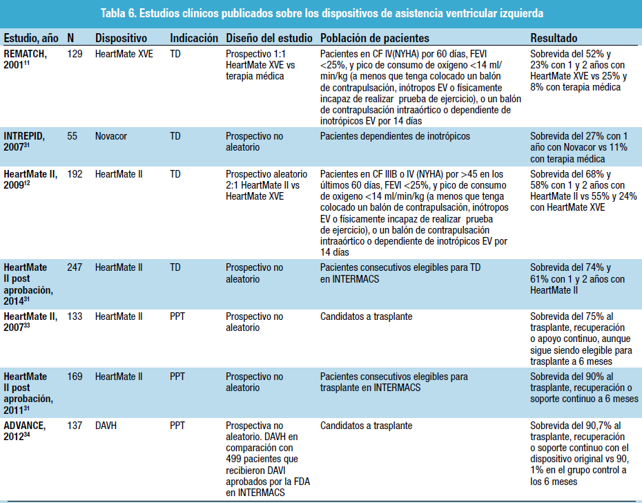 N: número de pacientes. CF: clase funcional. NYHA: New York Heart Association. PPT: puente para trasplante. TD: terapia de destino. FEVI: fracción de eyección del ventrículo izquierdo. EV: endovenoso. FDA: Food and Drug Administration. DAVH: dispositivo de asistencia ventricular HeartWare. INTERMACS: Registro Interinstitucional de soporte de Asistencia Circulatoria Mecánica. INTREPID: investigación de pacientes no elegibles para trasplante que son dependientes de inotrópicos. DAVI: dispositivo de asistencia ventricular izquierda. REMATCH: evaluación aleatoria de la asistencia mecánica para el tratamiento de la insuficiencia cardíaca. ADVANCE: evaluación del dispositivo de asistencia ventricular HeartWare para el tratamiento de la insuficiencia cardíaca avanzada.