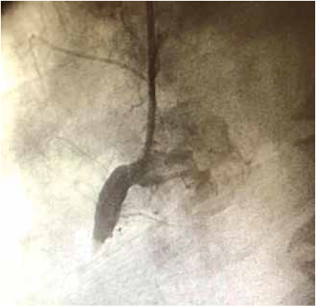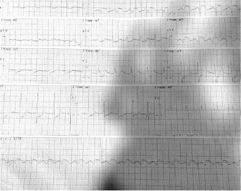 Paciente de 76 años, sexo masculino, tabaquista. Ingresa por dolor precordial y disnea clase funcional II (CF II) según NYHA (New York Heart Association). El electrocardiograma (ECG) reveló supradesnivel del segmento ST en cara inferior e infradesnivel del ST de V1 a V5, con una frecuencia cardíaca de 110 lpm aproximadamente, mostrando el compromiso ínfero-dorsal (Figura 1). Se realizó una cinecoronariografía que evidenció oclusión de arteria coronaria derecha (Figura 2), decidiéndose la realización de una angioplastia con colocación de stent BMS (Bare-Metal Stent).