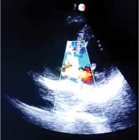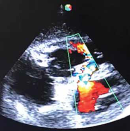 El ecocardiograma transtorácico Doppler color mostró un gran defecto septal serpiginoso a nivel del septum interventricular posterior, que comunicaba el ventrículo izquierdo con el derecho (Figuras 5 y 6).