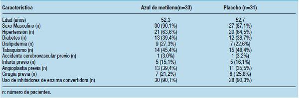 Treinta y tres pacientes recibieron AM, mientras que los 31 restantes fueron tratados con placebo. La dosis promedio de AM fue de 3,5 mg/ Kg con un rango de 2,5 a 5,0 mg/Kg. Las características generales de la población se expresan en la Tabla 1. Veinte (31,1%) pacientes desarrollaron vasoplejía postoperatoria, 6 (18,2%) pacientes en el grupo tratado con AM frente a 14 (45,2%) pacientes del grupo control (P=0,01; OR 0,27 con IC de 0,08- 0,84).