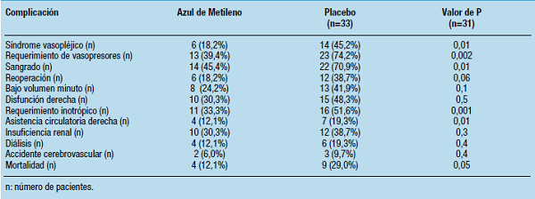 Conclusions. The preoperative use of MB was associated with reduction of vasoplegia and a lower vasopresor requirements. It was also observed reduction of postoperative complications and a trend to reduced mortality. A superior number of patients needs to be evaluated for proving the value of this strategy.