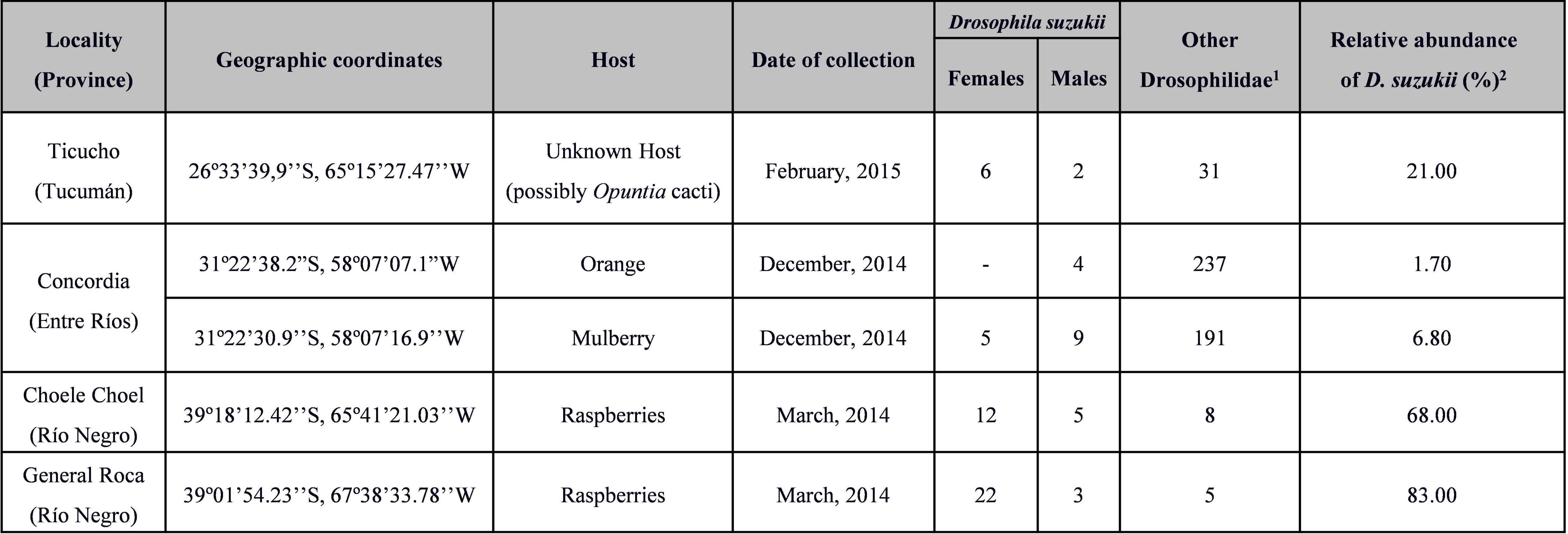 Drosophila suzukii represents 21% of the total sample of drosophilid flies in the sample from Ticucho locality (Fig. 1; Table I). Interestingly, the collection at this site was performed in an area where wild native cactuses of the genus Opuntia are the main host available. As reported elsewhere (González et al., 2015; Wang et al., 2016) Opuntia can be an alternative non-crop host for D. suzukii in suitable habitats. In Concordia area, our findings indicate that D. suzukii represents 6.8% of the total drosophilids collected in traps at the mulberry plantation, and 1.7% at Valencia orange plantation (Fig. 1; Table I). Although mulberries are considered one of the preferred fruit hosts of D. suzukii (Lee et al., 2015), our collecting data reveals a low relative abundance of this species in relation to other drosophilids. This could be the result of an inefficient trapping methodology and/or a consequence of low population size for D. suzukii given the recent colonization of this area. On the other hand, fly samples collected at the orange plantation in Concordia agree with the reports showing that D. suzukii can use hard skinned fruits as hosts, such as oranges, as long as they are overmature, decaying or previously damaged (see Vilela & Mori, 2014; Asplen et al., 2015; Andreazza et al., 2017 for reviews). The relative high abundance of D. suzukii that emerged from raspberries in Choele Choel and General Roca localities, 68% and 83% respectively (Fig. 1; Table I), evidence the known preference of this species for this cultivated exotic host (Abraham et al., 2015; Poyet at al., 2015). This record represents the presence of D. suzukii at southernmost latitude in South America, as shown in Figure 1.