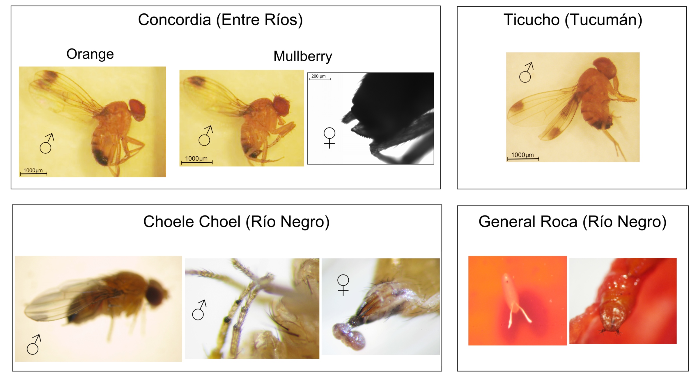 Females were photographed using a camera mounted on a Leica DMLB stereo microscope using Leica Application Suite 4.0 software. Males were photographed using a camera mounted on a Leica MZ6 stereo microscope. Embryo and pupa from General Roca were photographed using a digital camera Canon PowerShot G9 mounted with Soligor Adaptor Tube G7 on a Zeiss Stemi DV4 Stereo Microscope.