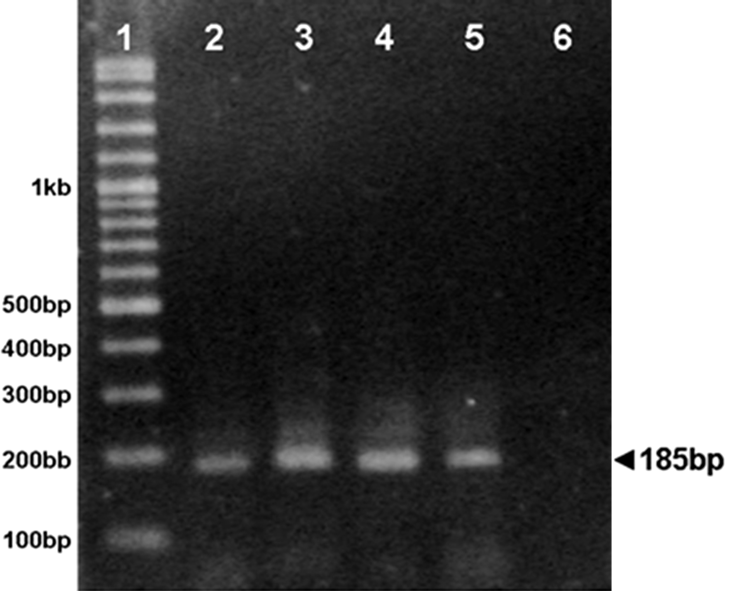Calle 1: Marcador de pares de bases –pb- (Fermentas); Calle 2: control positivo para IAPV; calles 3, 4 y 5: Amplificación positiva para IAPV; calle 6: control negativo (mezcla de PCR sin molde).