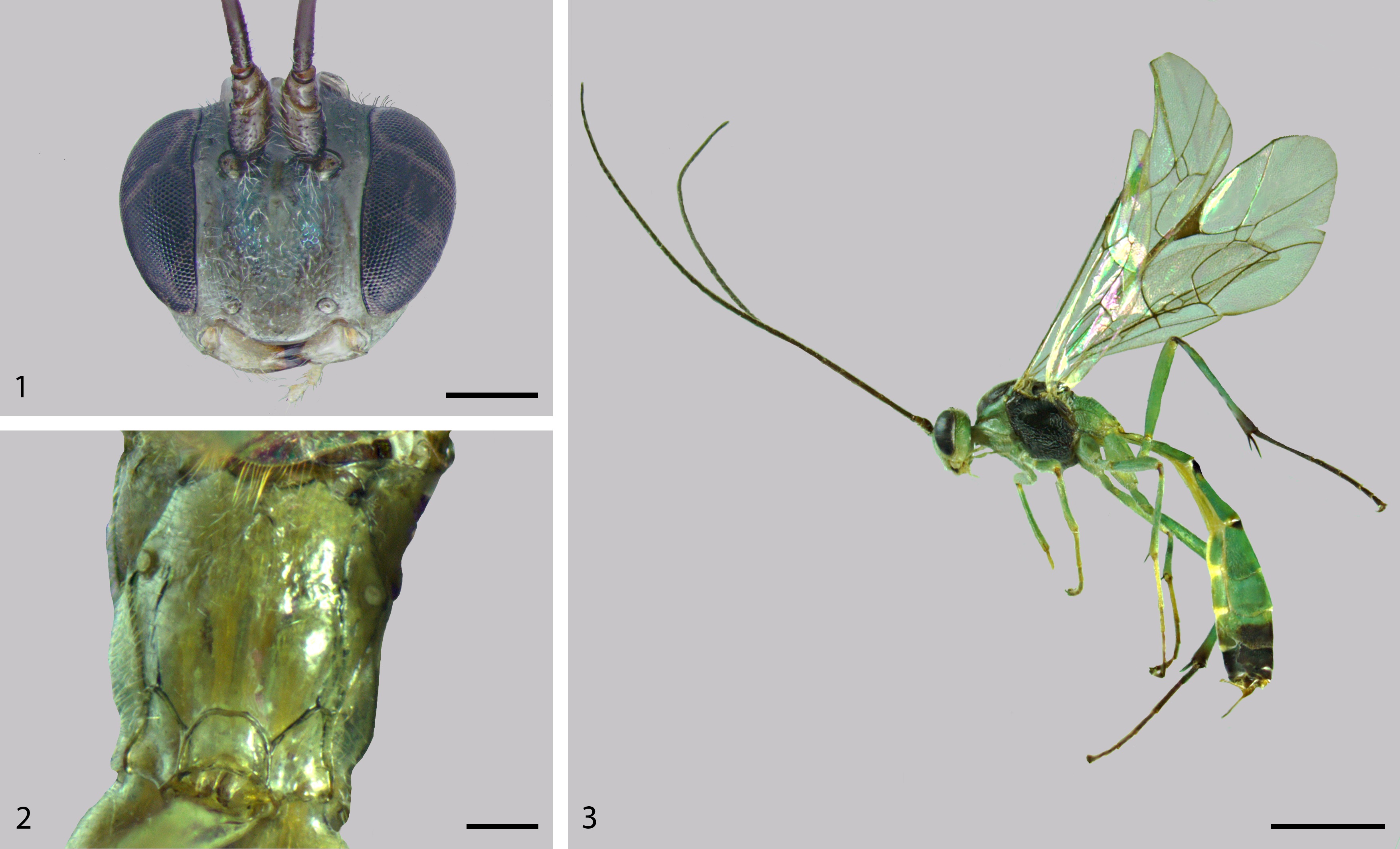 Description: Male (Figs. 1–3). Approximate body length: 8.5 (mm). Fore wing length: 6.4 (mm); antenna length: 8.1 (mm); number of flagellomeres: 40–42; head 1.20× as wide as high (frontal view); head punctate with sparse whitish setae (Fig. 1); distance between eye and lateral ocellus 1.00× as long as the diameter of lateral ocellus; frons smooth; clypeus 3.00× as wide as high; clypeal sulcus weakly discernible; mandible 2.85× as long as the basal width (frontal view); mandible with two well developed teeth; mandible basal width 1.70× as long as malar space; pronotum polished; epomia present; hind femur 7.00× as long as wide; hind tibia 10.90× as long as wide; hind basitarsus 13.40× as long as wide; mesosoma generally smooth, polished and finely punctate; areolet large, rhomboid, 1.70× as wide as long; hind wing with 5 distal hamuli; propodeum smooth, with isolated punctures; areola absent, but with subpentagonal area delimited by complete lateral longitudinal and posterior transverse carina and incomplete anterior transverse and median longitudinal carina (Fig. 2); area externa, lateralis, petiolaris and postero-externa discernible; T1 smooth, with isolated punctures; glymma deep; postpetiole 1.95× as long as its maximum width; T2 4.10× as long as its maximum height (lateral view); T2–T7 similarly sculptured; Parameres elongated, needle-shaped (Fig. 3).