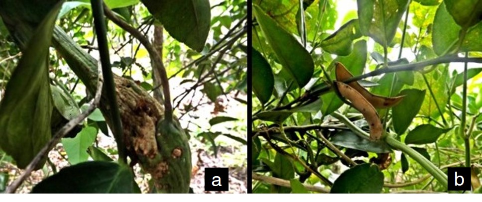 From September 2015 to July 2016, pods stems of plants damaged by larvae were collected every 14 days. Both were collected from approximately 180 bean plants and 80 canavalia plants with symptoms and signs. For collecting, pruning shears were used and the material was placed in paper bags to transport it to the laboratory (Fig. 1).