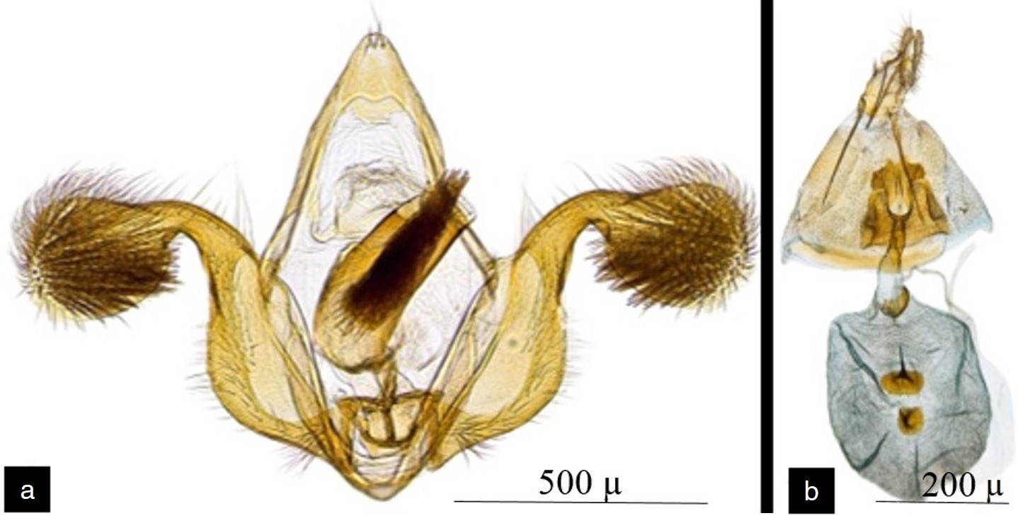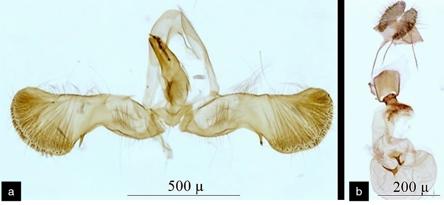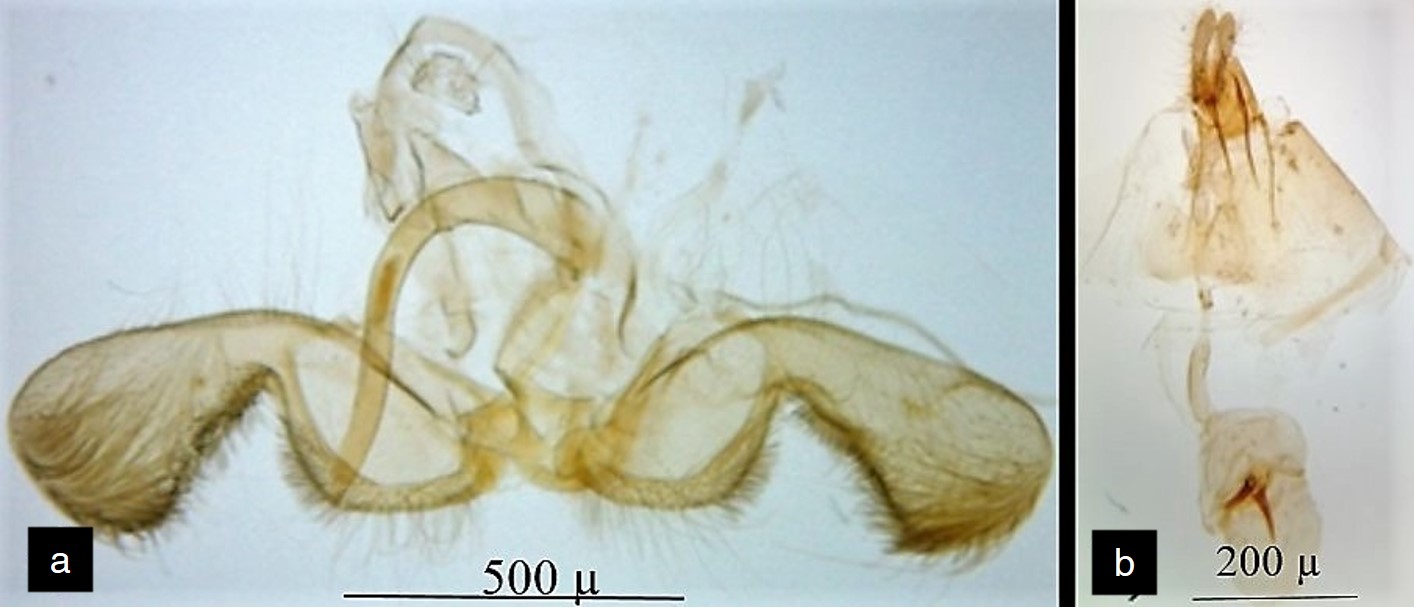 Thirty bean pods and twenty canavalia pods with signs of damage were placed in plastic boxes with perforated lid of 20 x 40 cm on a layer of soil and plant litter at room temperature (27 ± 2 °C), and sealed with Parafilm for maturation of larvae into adults. Once the adult specimens emerged, identification was made by extraction and assembly of genitalia, with the support of the Carl Zeiss Stemi 1000 stereoscopic microscope and the Carl Zeiss Axiostar brightfield compound microscope. Finally, the rest of both adult and larval specimens were preserved in 70% ethanol.