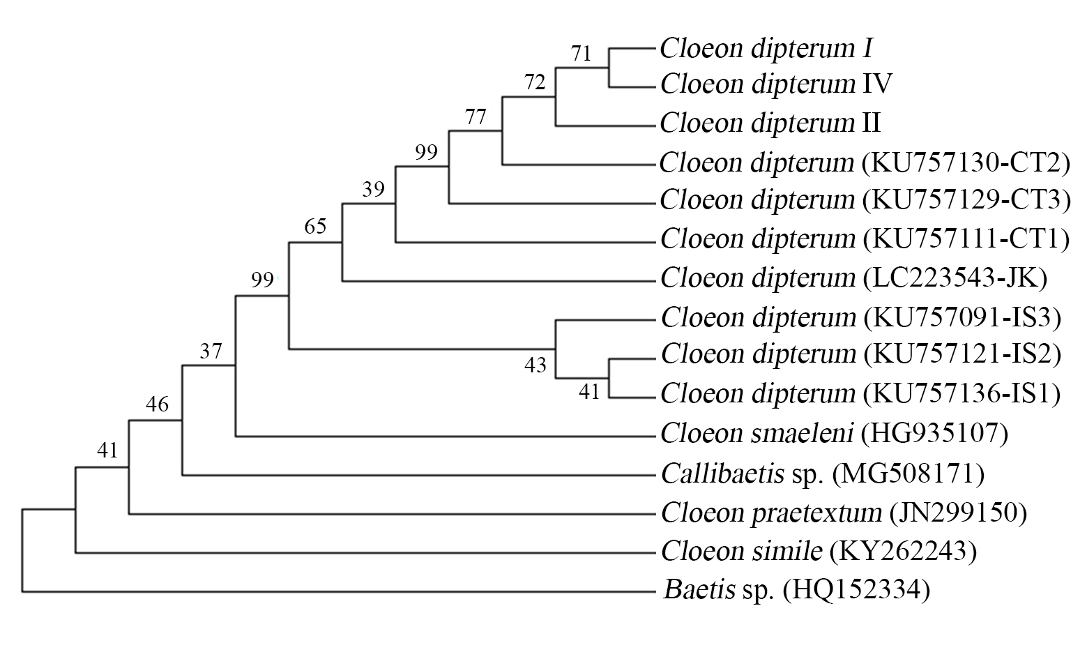 For the genetic identification of the nymphs, the DNA was extracted from four entire individuals fixed and preserved in 96% ethanol by the phenol-chloroform method (Sambrook et al., 1989). Fragments of the mitochondrial DNA Cytochrome Oxidase subunit I (COI) gene of approximately 650 bp were amplified using primers LCO 1490 (GGTCAACAAATCATAAAGATATTGG) and HCO 2198 (TAAACTTCAGGGTGACCAAAAAATCA) (Folmer et al., 1994). Each PCR had a reaction volume of 20 μl and contained 2 μl of 10X Pegasus Taq DNA Polymerase Buffer, 0.6 μl of 50 mM MgCl2, 0.4 µl of 10 mM deoxynucleotide triphosphates, 1 μl of 10 μM forward and reverse primers, 0.1 μl of 5 U/μl Pegasus Taq Polymerase (EmbioTec), 5 μl of DNA extract and water to reach the final volume. The amplification protocol consisted of a single denaturation step at 95 °C for 2 min, followed by 35 cycles of denaturation at 95 °C for 1 min, annealing at 40 °C for 30 s, extension at 72 °C for 1 min, and a final extension at 72 °C for 5 min. Amplification reactions were carried out in a MasterCycler (Eppendorf) thermal cycler. PCR products were resolved in 1% agarose gel electrophoresis and visualized under UV light. Then, 15 µl of each PCR product was purified using the enzymatic method EXO/SAP (Werle et al., 1994) and sent to an external laboratory (Macrogen Inc., Korea) for direct sequencing using the same oligonucleotide primers. The sequences obtained for the COI gene were manually edited using Chromas 2.6 software (http://www.technelysium.com.au/chromas.htm) and aligned using ClustalX 2.1 (Thompson et al., 1997). Then, they were compared with the sequences for different species of the family Baetidae available in GenBank by using the Basic Local Alignment Search Tool (BLAST). Finally, a phylogenetic analysis was performed by the Maximum Parsimony method using the Molecular Evolutionary Genetics Analysis (MEGA-X) software (Kumar et al., 2018) with 1,000 bootstrap replications. The COI sequences obtained were related to sequences representing each of the seven genetic haplogroups described for C. dipterum (Accession numbers: KU757091, KU757111-21-29-30-36, and LC223543; Yano et al., 2019) and sequences belonging to other Cloeon or Baetidae species available in GenBank: Cloeon simile Eaton, C. smaeleni, Cloeon praetextum Bengtsson, and Callibaetis sp. (Accession numbers: KY262243, HG935107, JN299150 and HM917067, respectively). A sequence belonging to Baetis sp. (Accession number HQ152334) was used as outgroup.