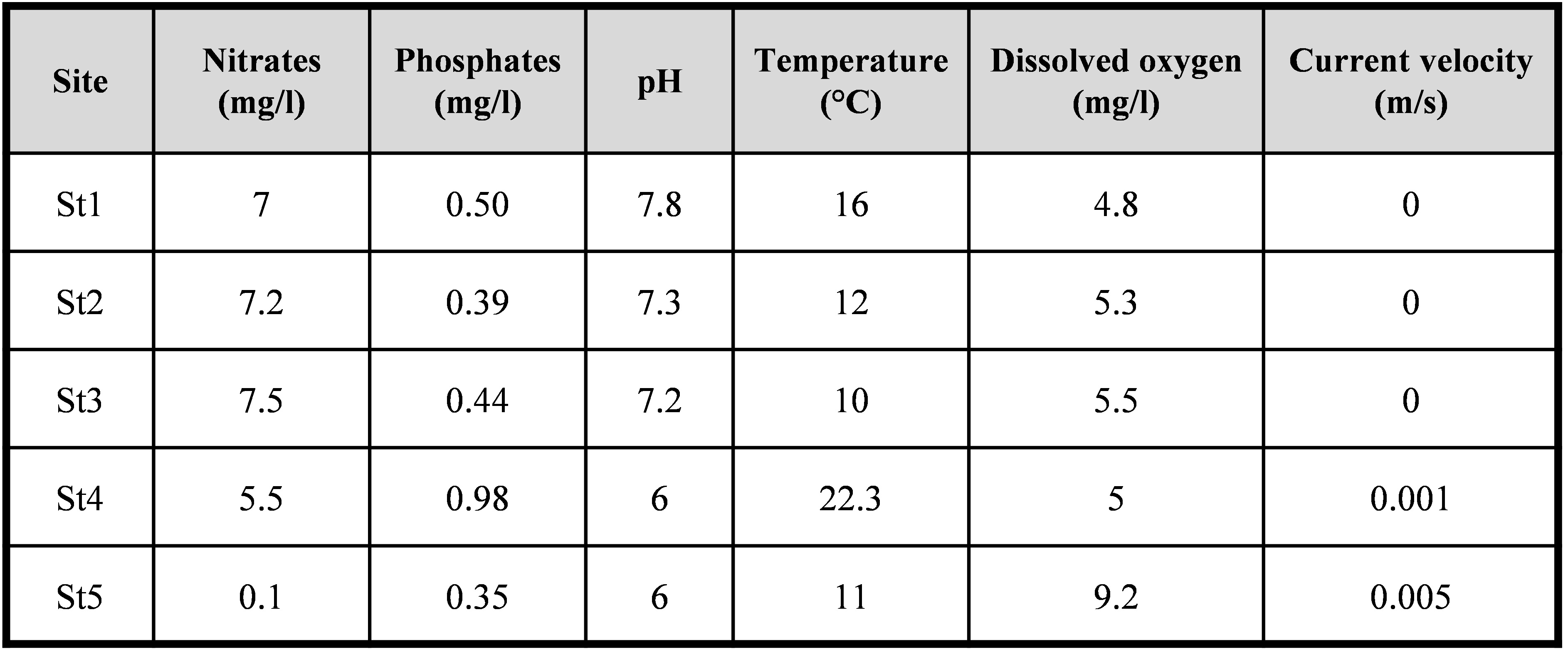 The swimming pools from which the nymphs were collected were located in private homes and were of different dimensions: two of base dimensions 4.45 × 2.25 m and 0.80 m deep and one of base dimensions 4 × 7 m and 1.5 m deep; the bottoms of the three swimming pools were covered with leaf litter of Pinus sp., Populus sp., Juglans sp., Liquidambar sp. and Laurus nobilis L. The Carabassa and Burgueño streams had slow or zero current sectors, and were colonized by submerged (Egeria densa Planch, Potamogeton sp.), floating (Polygonum sp., Hydrocotile sp., Ludwigia sp., Sagittaria sp.) and emerging (Alternathera sp.) macrophytes. Both streams had riparian vegetation with trees and shrubs. All collection sites were characterized by low current velocity, slow levels of nitrates and low dissolved oxygen values, except St5 (Table I).