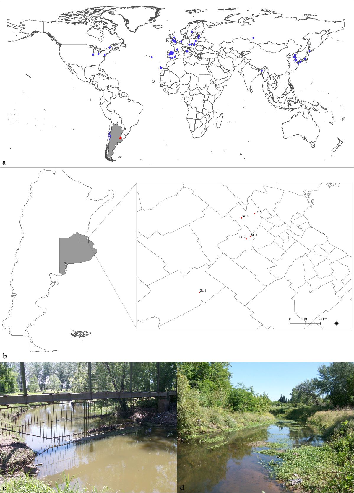 Nymphs were collected from three swimming pools, one located in Navarro (St1) and two in General Rodríguez (St2 and St3), and two tributary streams of the Luján River, located northeast of Buenos Aires province (Carabassa stream -St4- and Burgueño stream -St5-). The geographical records of the species were mapped with QGIS (version 3.4.9) (Fig. 1).