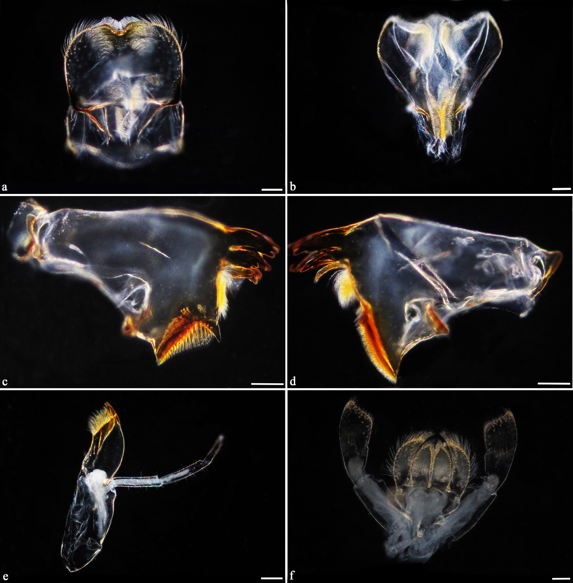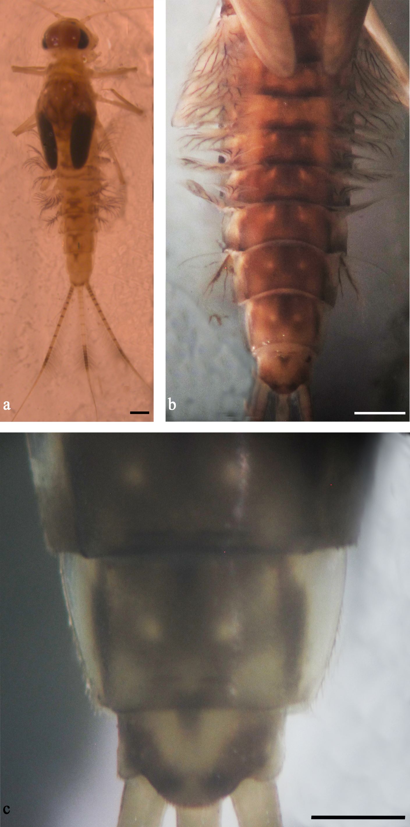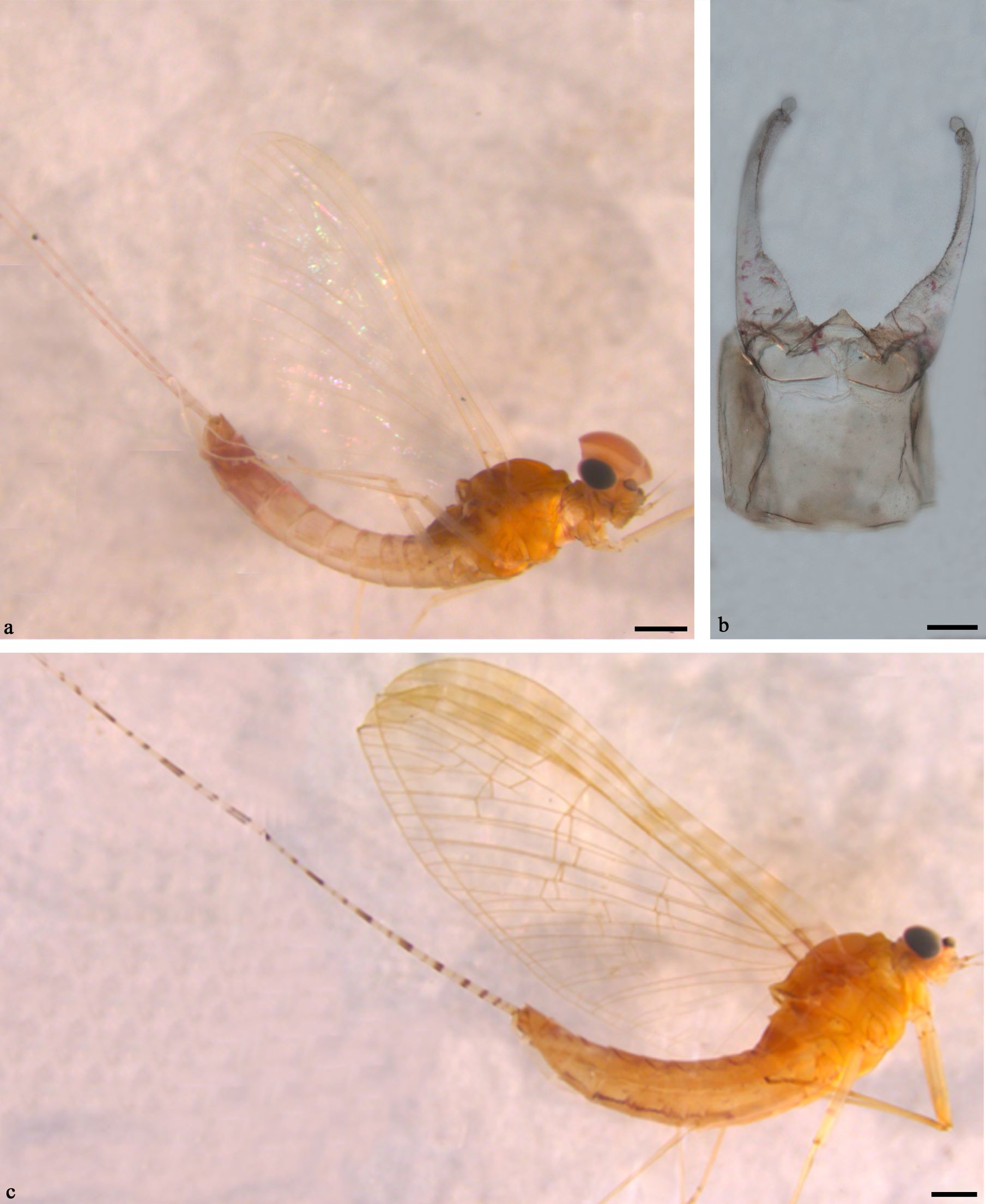 The main diagnostic characteristics of adults (6-8 mm) were the forewings, with single intercalary veins and absence of hindwings (Fig. 5a, c). The coloration of the body is orange-yellowish with rust-colored circular spots on the abdomen. The eyes in males are turbinate, from medium to large widened upwards (Fig. 5a), whereas in females the compound eyes are ornamented with two brown longitudinal bands. In the male genitalia the forceps are thin and their basal segment, whitish, is distinctly shorter than the second, being these strongly separated from the third. The base of the third segment has a small spur (Fig. 5b). The penis is a cone bent backwards, more strongly sclerotized on the ventral side, attached to the body with two arms, and can be attached back and move up and down. The terminal filaments of both sexes are clear with black rings.