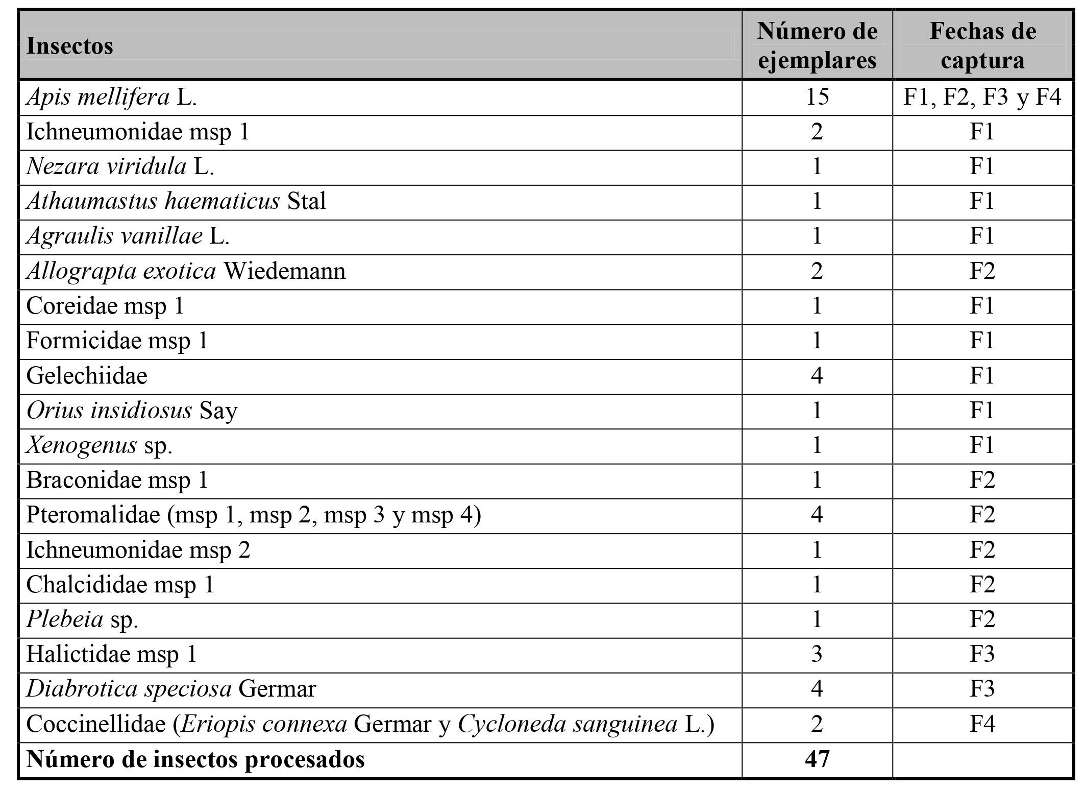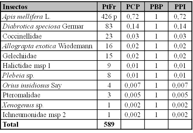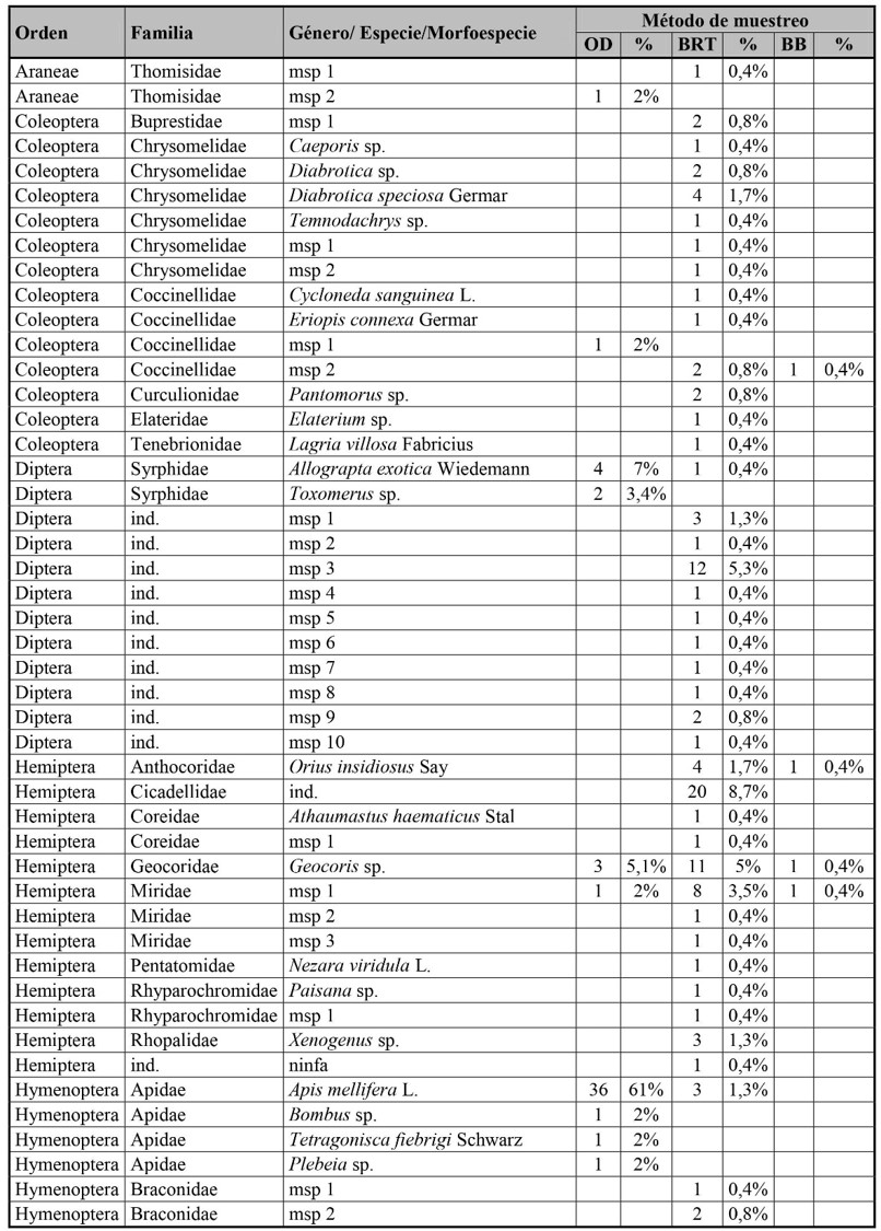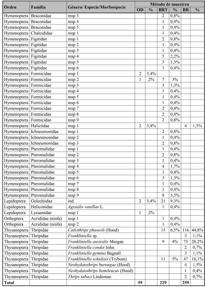 Los órdenes que se destacaron por su abundancia fueron: Thysanoptera (286), Hymenoptera (118) y Hemiptera (61), mientras que los mejor representados por su riqueza fueron Hymenoptera (cuatro géneros, cuatro especies y 34 morfoespecies), Coleoptera (ocho géneros, nueve especies y cinco morfoespecies) y Hemiptera (seis géneros, seis especies, cinco morfoespecies y una ninfa indeterminada). A partir del método de observaciones directas se registraron 59 visitantes florales, en su mayoría abejas, pero sólo se capturaron 27. Apis mellifera fue la visitante floral más frecuente, seguida de Allograpta exotica Wiedemann y Geocoris sp. Del método de barridos con red en transectas se recolectaron 229 individuos del follaje, principalmente Gelechiidae, Cicadellidae y Caliothrips phaseoli (Hood). Y con el método de trampas bee bowls se obtuvieron 259 individuos, siendo las especies más relevadas C. phaseoli, Frankliniella australis Morgan y F. schultzei, todas pertenecientes a Thripidae (Tabla I).