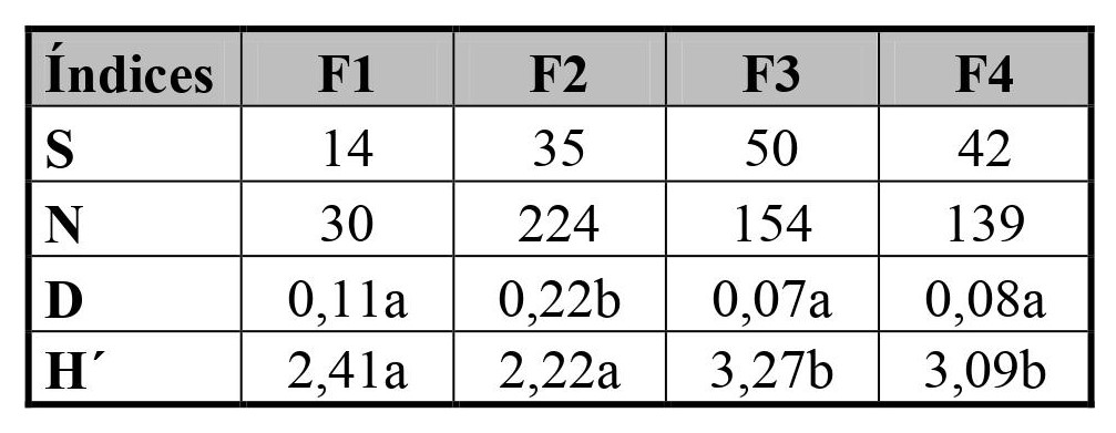 S = riqueza; N = abundancia; D = índice de Dominancia; H´ = índice de Shannon Wiener; F1 = 16 de noviembre; F2 = 30 de noviembre; F3 = 7 de diciembre; F4 = 14 de diciembre.