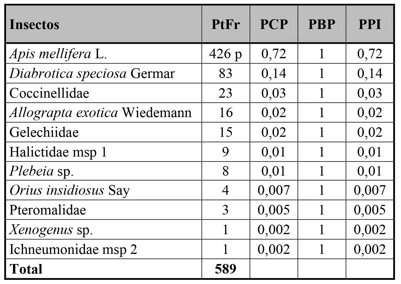 p = promedio de las abundancias de polen de Fragaria ananassa en Apis mellifera; PtFr = polen transportado de Fragaria ananassa correspondiente a cada taxón; PTFr: suma polínica total de Fragaria ananassa de los taxa considerados; PCP: proporción de polen transportado de Fragaria ananassa (PtFr/PTFr); PBP:proporción de individuos que presentó polen transportado de Fragaria ananassa. PPI: (PCP * PBP).