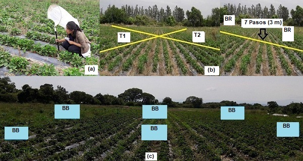 Para las observaciones directas de los artrópodos visitantes florales, en cada fecha se eligieron al azar cinco grupos de 20 a 25 plantas de frutilla en flor; cada grupo fue observado durante 10 min, entre las 09:00 y 13:00 (Fig. 1 a). Los visitantes se capturaron y se colocaron individualmente en frascos con etanol al 70%. También se efectuaron barridos con red entomológica en transectas en formato “X” y se colocaron trampas de caída bee bowls (Gill & O´Neal, 2015). Cada transecta fue muestreada dos veces, efectuando 10 barridos con la red sobre el follaje, a intervalos de siete pasos (Fig. 1 b). Las muestras obtenidas se colocaron en bolsas de tela y estas a su vez, en frascos mortíferos. Las trampas de caída se elaboraron con envases de plástico de 100 cm. forrados con papel contact celeste y a cada una se le agregó agua con detergente (10 cm. de detergente en un litro de agua). En total se colocaron seis trampas (Fig. 1 c), cada una sobre un soporte de hierro a la altura de las plantas (aproximadamente 30 cm), asegurada con cinta adhesiva y con permanencia durante las cuatro horas de muestreo. Luego se cerraron y etiquetaron para su limpieza y revisión. Todo el material recolectado fue depositado en el Departamento de Entomología del Instituto de Biología de la Altura de la Universidad Nacional de Jujuy (INBIAL-UNJu) para su estudio taxonómico. También se colectaron flores del cultivo, que fueron preservadas según las técnicas convencionales de herborización.