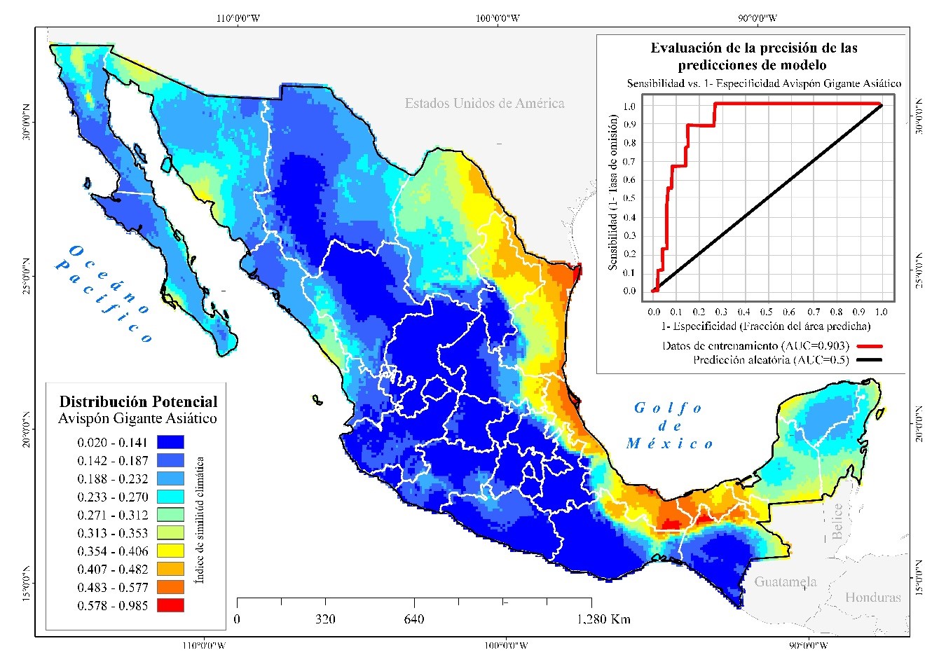 El modelo cartográfico de riesgo sanitario puede considerarse una herramienta tecnológica con el potencial de fortalecer las acciones de prevención ante la posible, introducción establecimiento y dispersión de especies consideradas invasoras, como el avispón gigante. Nuestros resultados otorgan un sustento técnico/científico que permite coadyuvar en el fortalecimiento de estrategias en el control y manejo de plagas exóticas, al explicar su variabilidad y la capacidad de dispersión (Tapia-Rodríguez et al., 2020). Sumado a esto, este tipo de enfoques ha contribuido en la evaluación de la incidencia de plagas y enfermedades trasfronterizas (Márquez-Pérez et al., 2018) y es utilizado en la definición de clúster de riesgo fitosanitario (Rivera-Martínez et al., 2020).