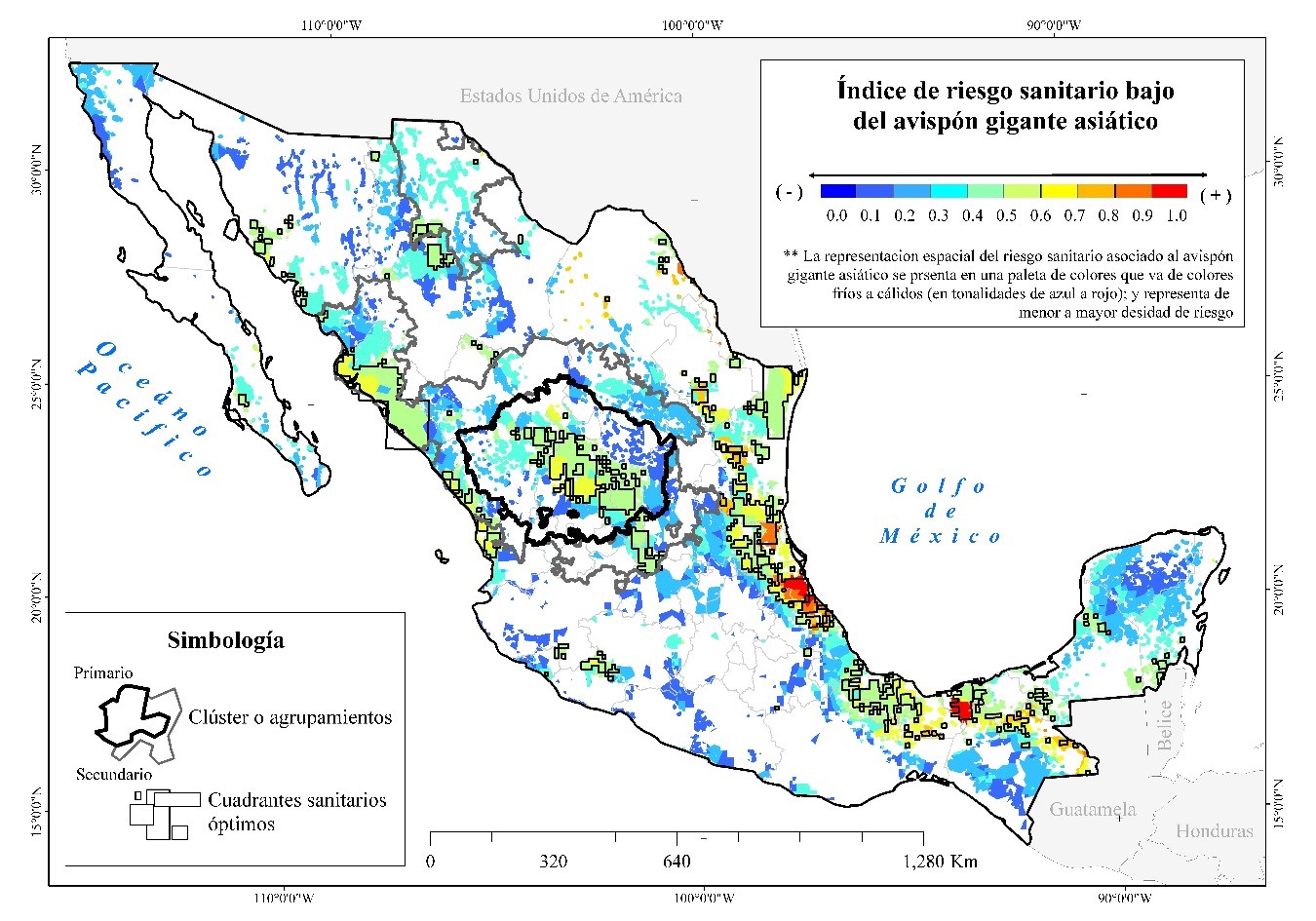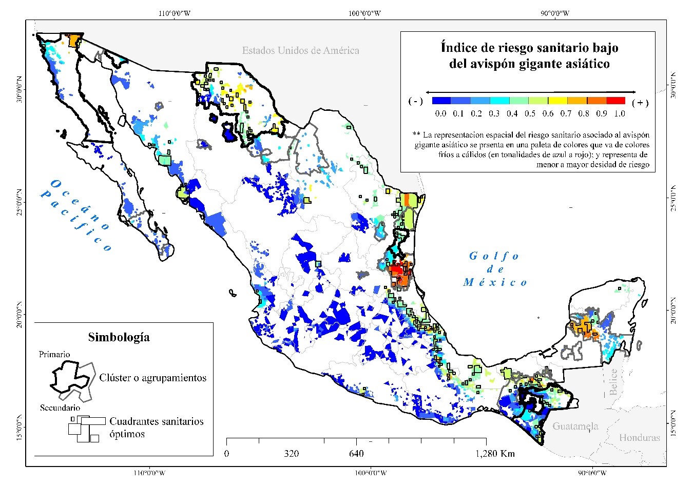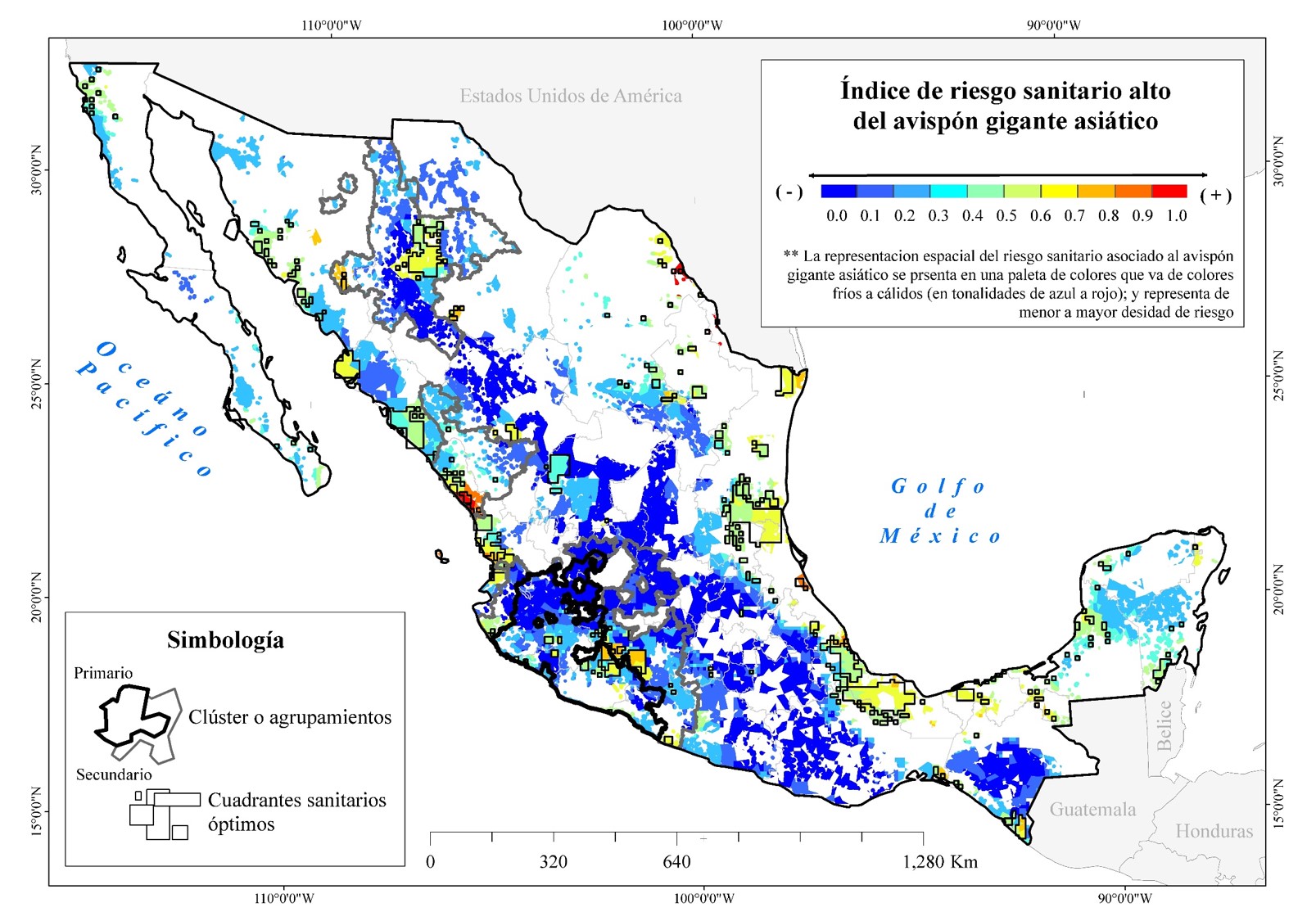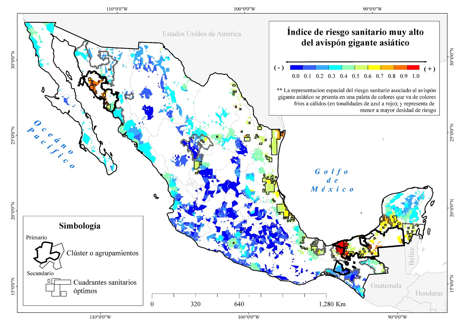 De manera específica se identificaron porciones territoriales prioritarias para establecer o direccionar estrategias preventivas ante una posible introducción o establecimiento de V. mandarinia, las cuales se denominaron cuadrantes sanitarios que involucran superficie sembrada de cultivos agroalimentarios según porcentaje de priorización. Así como los denominados clúster agroalimentarios se realizaron conforme al patrón de distribución de cada nivel de riesgo sanitario (bajo, medio, alto y muy alto), lo anterior, se realizó mediante la integración de las relaciones interespescíficas de la biología y hábitos del avispón gigante asiático, considerado un agente con potencial devastador para la apicultura y en consecuencia para la agricultura. En un contexto espacial epidemiológico, se identificaron regionalmente 4.556 cuadrantes en riesgo sanitario, de los cuales el 27,34% se pueden considerar cuadrantes prioritarios. Además, fueron definidos 17 clúster sanitarios que epidemiológicamente cumplen con las condiciones que favorecen la introducción o establecimiento de V. mandarinia.