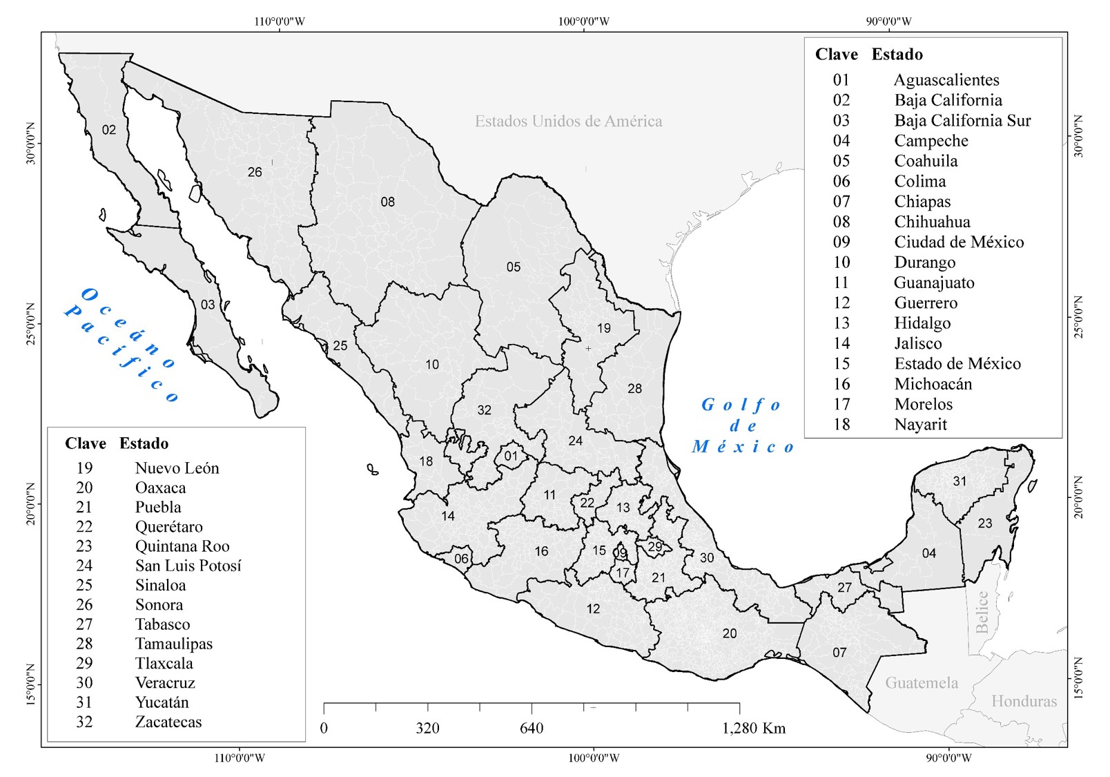 De acuerdo con Instituto Nacional de Estadística Geografía e Información (INEGI, 2021), la República Mexicana se localiza en la porción meridional de Norteamérica en el continente americano, colinda al norte con Estados Unidos de América y al sur-sureste con Guatemala y Belice, así como con el Golfo de México y el Océano Pacifico, al este y oeste, respetivamente. Administrativamente se integra por 32 entidades federativas y 2.471 municipios (Fig. 1).