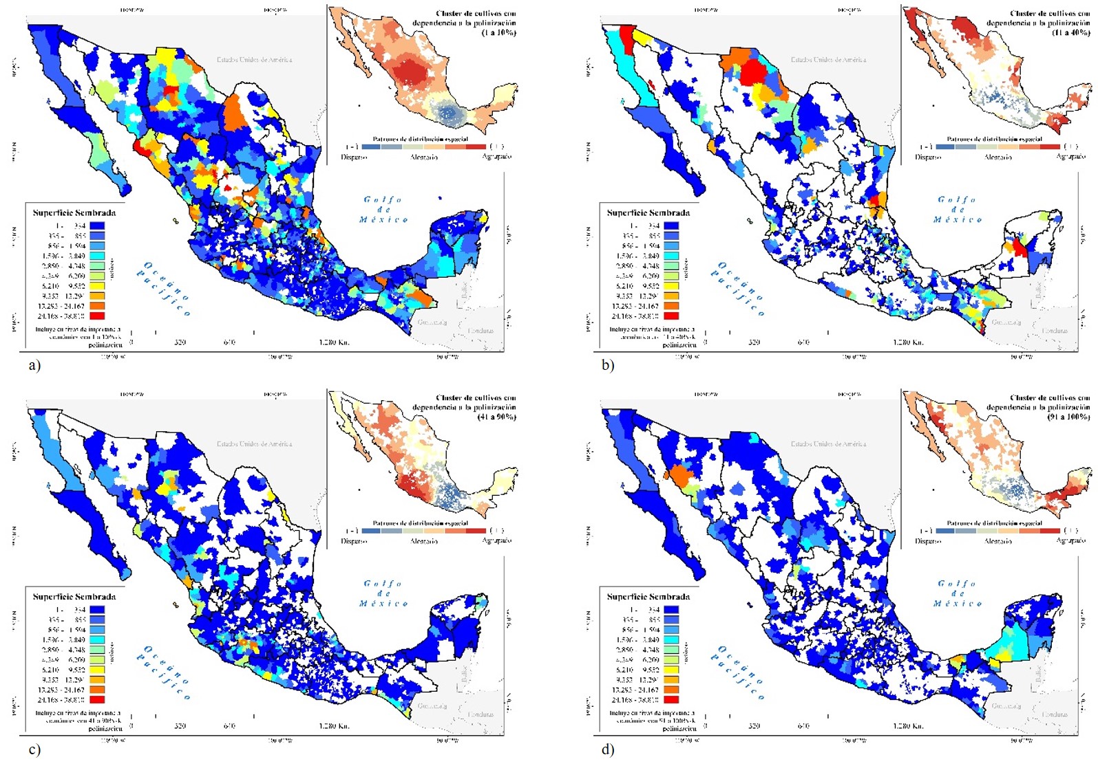 El modelado y caracterización de productos dependientes de polinizadores en México identificó 5.141.355 ha de cultivos agroalimentarios susceptibles con cierta dependencia a la polinización (Figs. 2a, 2b, 2c, y 2d). Sin embargo, conforme con la importancia de polinización, el 4,88% de la superficie identificada requiere de una polinización totalmente efectiva (91 a 100%), un 13,50% requiere entre el 41 y 90%, 24,69% entre 11 a 40% y finalmente, más de la mitad de la superficie (57%) requiere de 1 a 10% de la polinización.