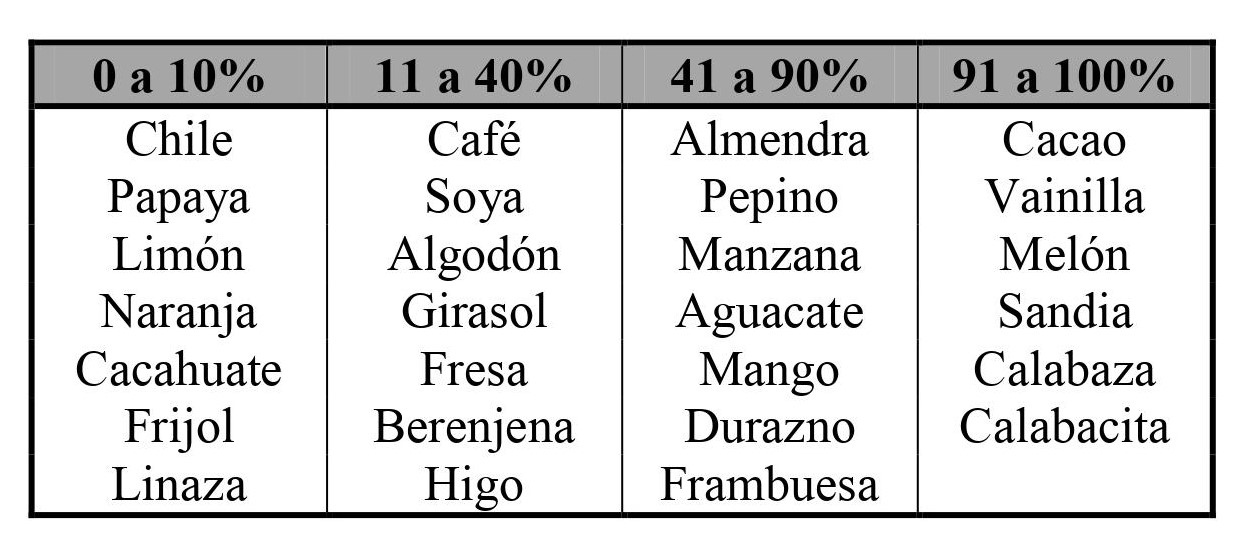 La polinización es determinante en la calidad de productos agroalimentarios específicamente en sabor, olor, color y valor nutrimental (Klein et al., 2007). Para cuantificar cuanto dependen los cultivos de sus polinizadores, se utilizó la agrupación de productos agroalimentarios expresado en porcentaje de polinización de acuerdo a Heiblum-Robles (2019), en la que evidencia cultivos de importancia económica y su porcentaje de polinización, los cuales se agrupan en los cuatro rangos señalados en la Tabla I. El impacto más bajo, un 10% de déficit en la polinización, indica que se puede producir hasta un 10% menos de los cultivos implicados, y de manera extrema, un 100% de dependencia a la polinización indica que sin polinizadores no pueden existir esos productos agroalimentarios.