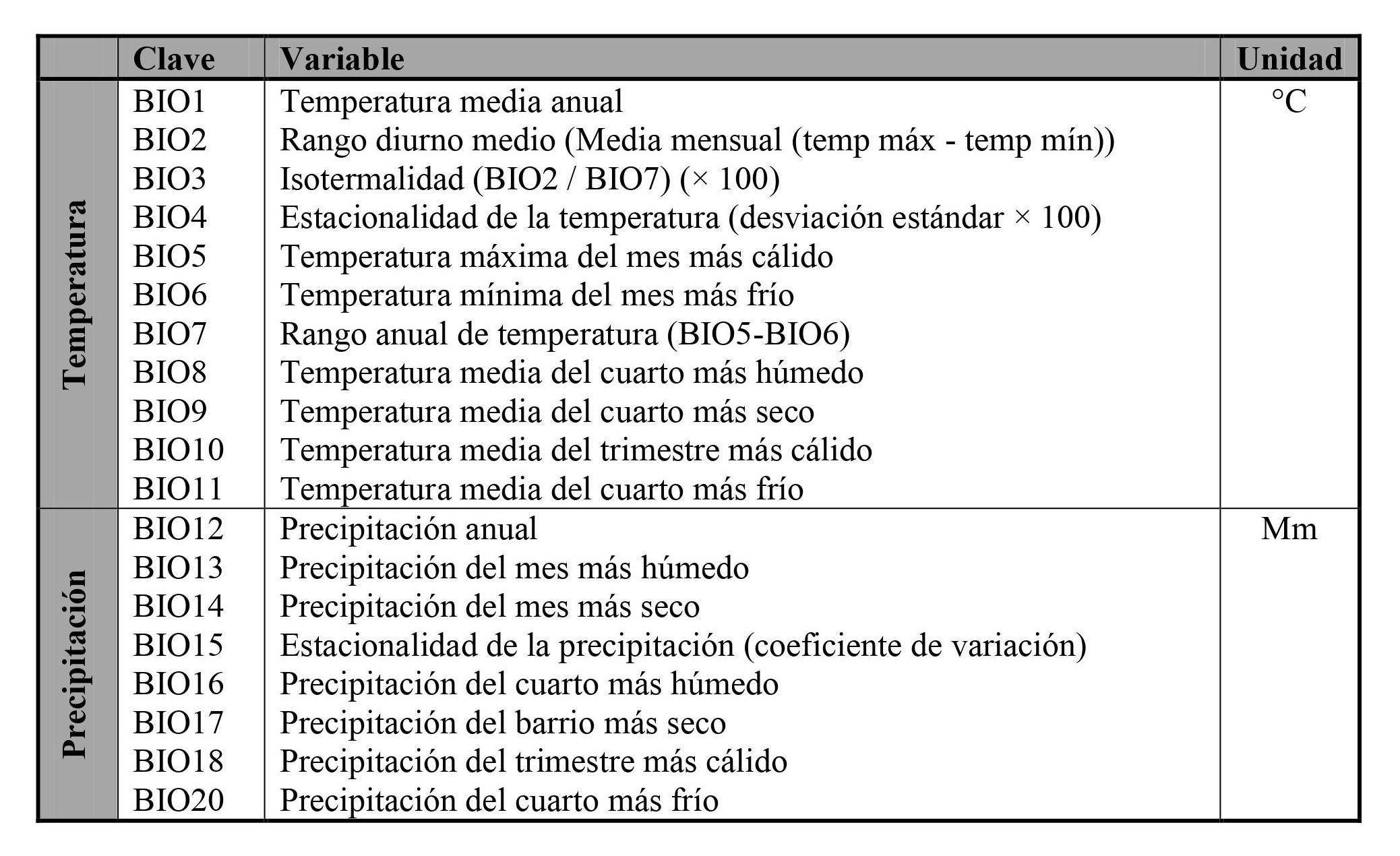 El segundo criterio que se estimó fue el modelo distribución potencial de V. mandarinia. Para ello, el modelo incorporó datos georreferenciados de las detecciones ocurridas a finales de 2019 en British Columbia y en Blaine en Norteamérica (Looney et al., 2020), como áreas invadidas, y en Pakistán (Khaliq-Khan et al., 2017) y Japón (Fujiwara et al., 2016) como áreas nativas. La distribución potencial se estimó a través de datos de presencia, expresados en coordenadas geográficas decimales (latitud, longitud) con Datum WGS84 (Ponder et al., 2001; Stockwell & Peterson, 2002). El procesamiento en el software de MaxEnt (Phillips et al., 2004), se inició con el uso de una semilla aleatoria de forma iterativa con un porcentaje del tamaño de la muestra de validación de 0.2. Este proceso se realizó por la asociación espacial entre los sitios de presencia con las variables ambientales de la base global BIOCLIM (Tabla II), en el software MaxEnt v3.3.3e. lo que permitió predecir la distribución probable de la especie (Phillips et al., 2004), siendo las áreas que satisfacen los requisitos del nicho ecológico las que permiten definir parte de la distribución potencial del avispón gigante asiático (Anderson & Martínez, 2004).