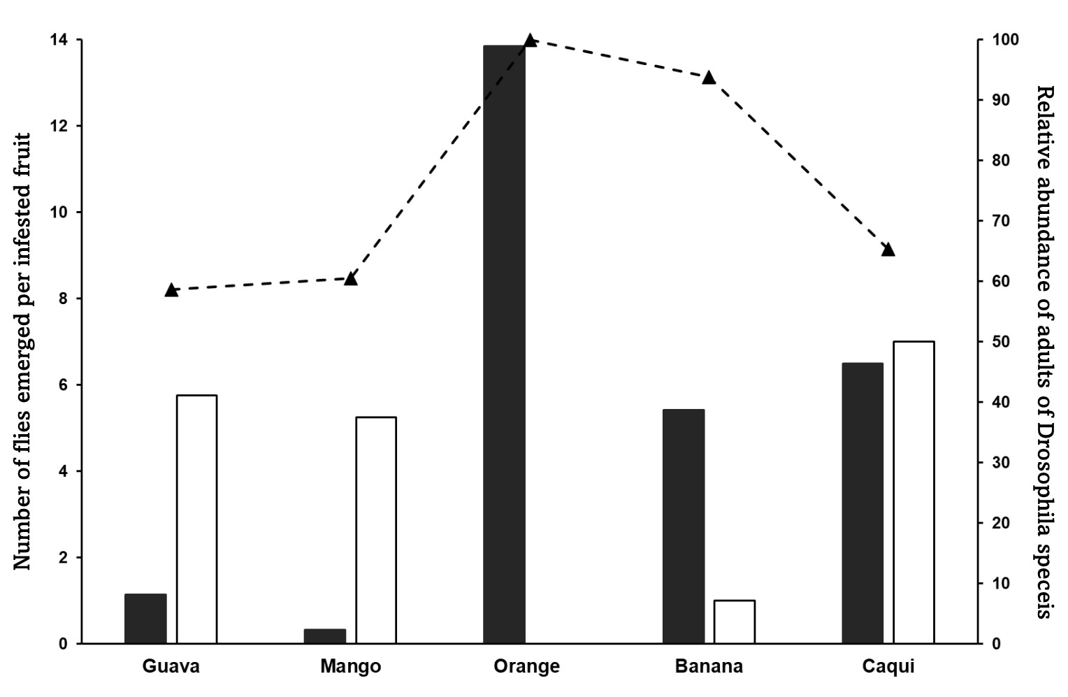 Abstract: Zaprionus indianus Gupta is an invasive pest species that has colonized the American continent in the last 20 years. This species is a polyphagous species that with Drosophila melanogaster Meigen and D. simulans Sturtevant utilized a wide variety of fruits as breeding and feeding resources. In the present study we quantified the relative abundance of these species in adult and emerged samples collected from various hosts (commercial fruits) in different localities in northern Argentina. We detected overlapping of rearing and feeding resources between the analyzed species although, our results revealed that the relative abundance between Drosophila and Z. indianus species varied between both adult and emerged samples. This result revealed a differential use of resources and/or interspecific competition.
