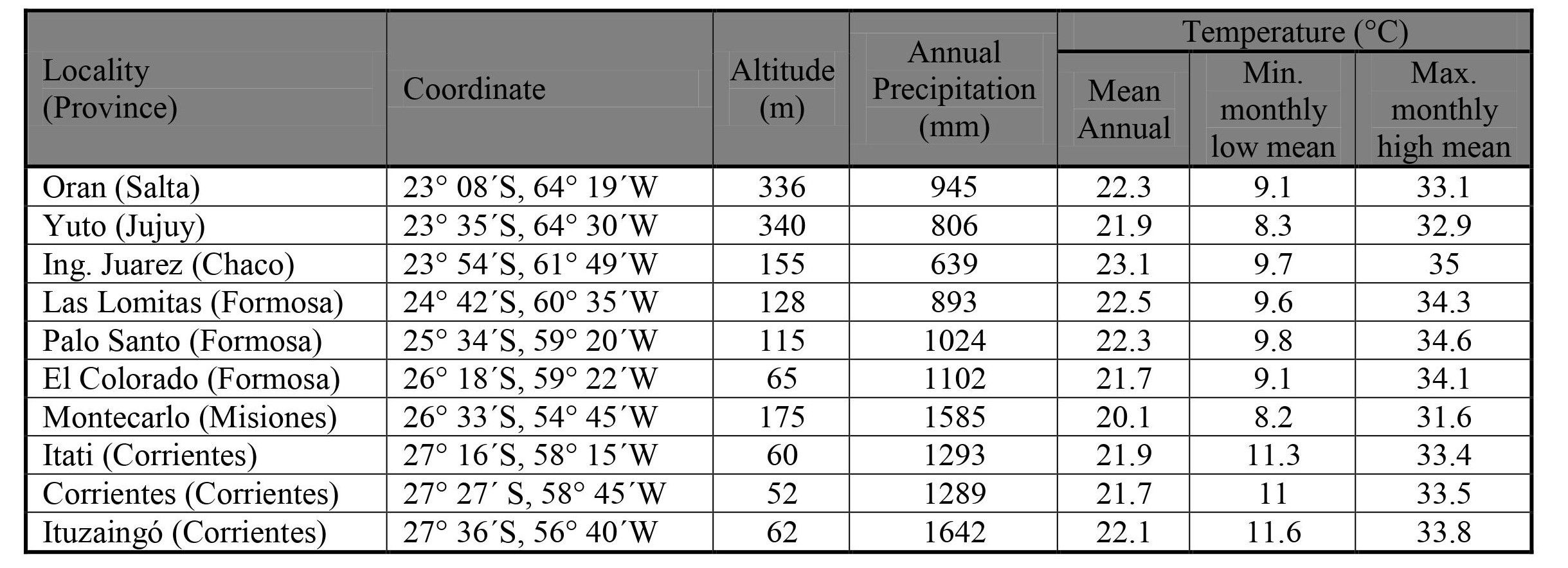 We would like to thank Estación Experimental Egropecuaria (INTA): Bella Vista, (Corrientes), Montecarlo (Misiones) and Yuto (Jujuy) for invaluable help during collecting trips. This work was supported by a grant from Agencia Nacional de Promoción Científica y Técnica (Argentina). NJL and JJF are members of Carrera del Investigador Científico of CONICET (Argentina).