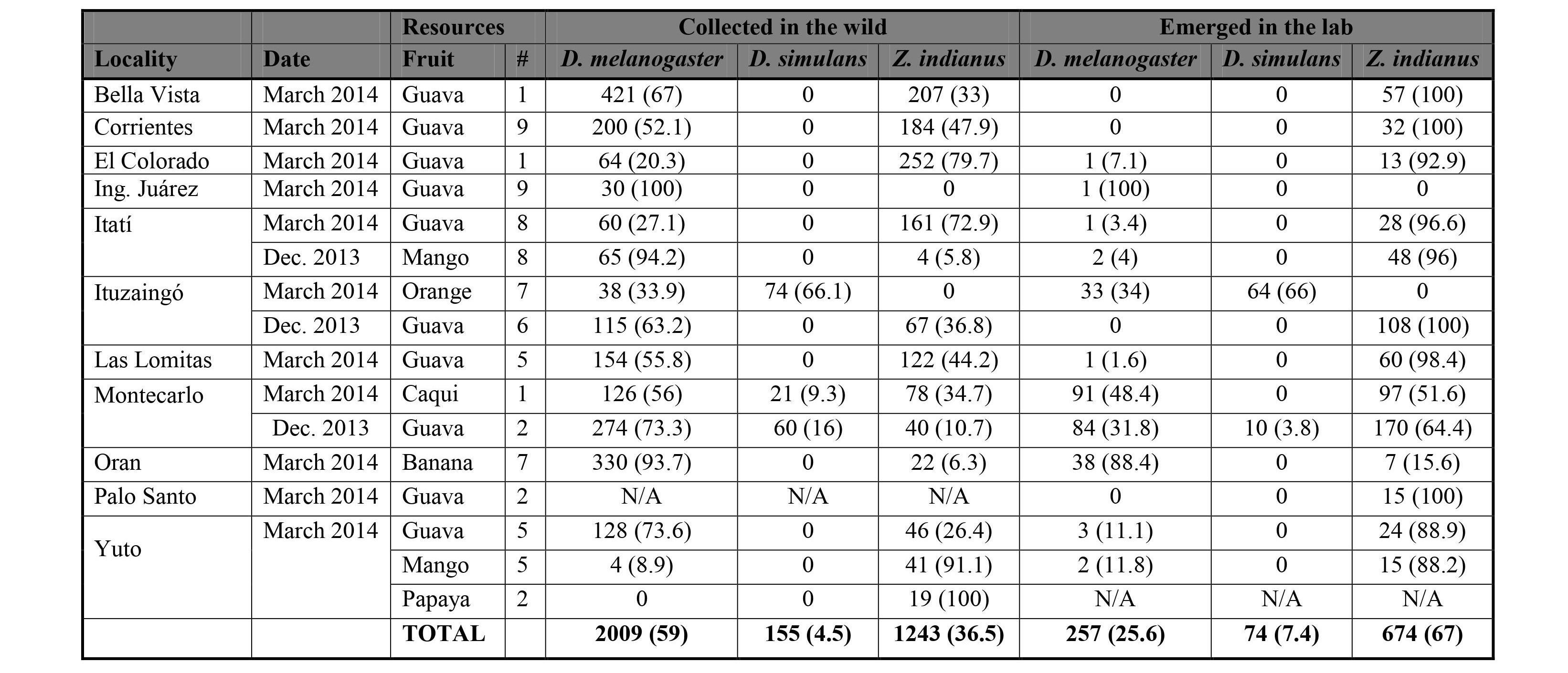 The proliferation of alien invasive species that rapidly colonize large areas provides an amazing opportunity to investigate the causes that allow their successful colonization (biological invasion), as well as the change they cause in already established communities. Zaprionus indianus Gupta (Diptera, Drosophilidae), also known as the African fig fly in South America and the striped vinegar fly in the USA, is a species native to the Afrotropical biogeographic region (Yassin et al., 2008). Aided by international trade and commerce (Hulme, 2009), about 30 years ago this species begun to expand its geographical distribution from its native range in Africa to other areas in the world (Vilela, 1999; van der Linde, 2006; Lavagnino et al., 2008; Commar et al., 2012; Kremmer et al., 2017). Z. indianus can be classified as a category E invasive species according to Blackburn et al. (2011), since it is fully invasive, with individuals dispersing, surviving and reproducing at multiple sites in many habitats. This species is considered a generalist and polyphagous species (Aluja & Mangan, 2007), since it can use a wide variety of decaying fruits as breeding and feeding resources (van der Linde et al., 2006; Lavagnino et al., 2008). This characteristic is perhaps one of the principal factors contributing to its rapid geographical expansion and successful colonization history. Thus, the spread of this generalist species through different habitats in North, Central and South American continents most likely involve different developmental environments, that is, different host fruits (van der Linde et al., 2006; Lavagnino et al., 2008). Zaprionus indianus is typically regarded as a secondary pest, since adult females normally oviposit in fruits that have been mechanically injured by other insects (Lasa & Tadeo, 2015;Bernardi et al., 2017) although, the presence of this species along with other insects is still concerning to soft-skinned fruits farmers. Thus, the presence of Z. indianus as well as other Drosophila species that were found in fruits injured in the first place by pest insect species as Anastrepha fraterculus Wiedemann (Diptera, Tephritidae), Ceratitis capitata Wiedemann (Diptera, Tephritidae) or Drosophila suzukii Matsumura (Diptera, Drosophilidae), can be associated with a greater release of volatiles that function as stimuli for orientation, attraction and oviposition (Bernardi et al., 2017). However, during the process of colonization to new areas Z. indianus became the north-eastern Argentina would be first pest in cultivars of strawberries (Fragaria × ananassa, Bernardi et al., 2017) and figs (Ficus carica L., Lasa et al., 2020) during geographic expansion in America. Certainly, adult females can oviposit on the fruit surface of intact ripe strawberry fruits, then larvae emerge, penetrate the epidermis and feed on the fruit pulp and yeasts (Bernardi et al., 2017). In the case of figs, females lay eggs on the bracts of the ostiole in intact fruits at the beginning of maturation and larvae enter the fruit through small natural wounds of the fruit (Lasa et al., 2020). Either as a primary or secondary pest, oviposition and subsequent larval feeding of Z. indianus on agricultural crops can contribute to decreased yields and rejected product. After the first record of this species in Argentina (Soto et al., 2006), it was determined that Z. indianus colonized different areas of Argentina (Lavagnino et al., 2008) and that the geographical expansion to north-eastern Argentina would be the consequence from a single introduction wave from Brazil (Goya et al., 2020). On the other hand, D. melanogaster and D. simulans are cosmopolitan sibling species that exploit several fermenting fruits as feeding and breeding sites. Considering that the worldwide expansion of D. simulans is more recent than its sibling species) and that D. melanogaster has a stronger association of with human activity (Keller 2007, Capy & Gilbert 2004), it would be more likely for this species to be sampled in the area evaluated. However, in a previous study, Vilela et al. (1980) detected that D. simulans was more abundant than D. melanogaster.