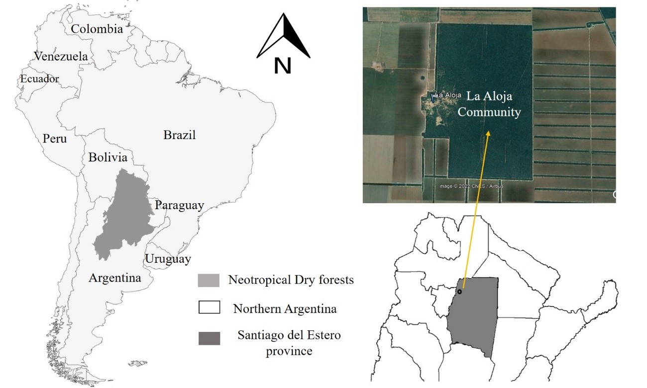 The study area of this work was located in the northwest of Santiago del Estero province, within the Pellegrini Department, between the city of Rapelli and the town of Pozo Betbeder (26°27'43.40"S, 64°22'26.48"W) (Fig. 1). The community of "La Aloja" is made up of 12 families whose homes are located within a 1,000 ha of native forest fragment. Half of this fragment is for communal use, while the other half is for private use. Its residents lack electricity or gas supply, so the main source of heat and energy is natural forest firewood. The vegetation structure is variable within the communal use area, being more open and degraded in the surroundings of the community. The vegetation consists of the typical species of the seasonal xerophyte forest that is characterized by two open tree strata with some scattered emergent and a continuous shrubby stratum (Morello & Adamoli, 1974; Tálamo et al., 2013). The upper stratum reach the 15m approximately, and is occupied by both "quebracho" species, the red (Schinopsis lorentzii (Griseb.) Engl.) and the more frequent white (Aspidosperma quebracho-blanco (Schltr.) Lyons). The middle stratum present species such as the "mistol" (Sarcomphalus mistol(Griseb.)), the "guayacán" (Caesalpinia paraguariensis (Parodi) Burkart), "brea" (Parkinsonia praecox (Ruiz & Pav.) Hawkins), several species of acacias, cacti and Neltuma (N. alba, N .ruscifolia and N. nigra Griseb.).