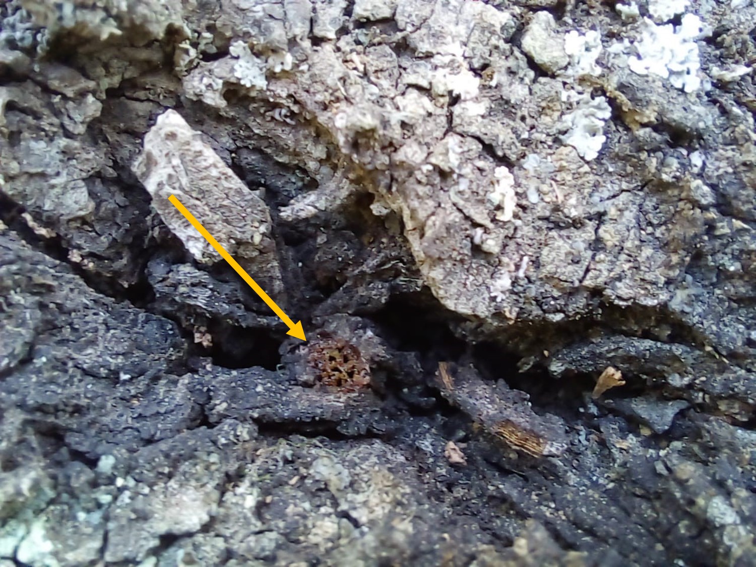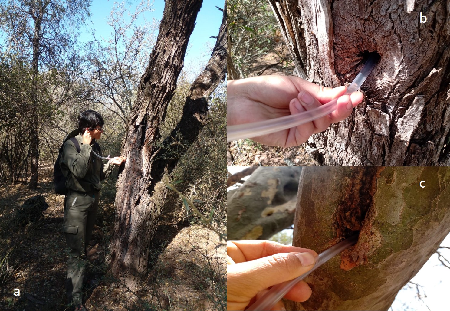 Previous studies referred to the stingless bees nesting mention that in order to find the nests, it is convenient to search for them when the bees are active and consider the flight activity of the foraging worker bees when leaving and entering the nest (Palacio, 2021). However, this method impedes from year-round evaluations, and samplings are restricted to the time of the day in which bees are active. In this study, the sampling took place once a month for two years (2020-2022) and consisted in walking and inspecting trees within the forest in a random design searching bee nests. When we discovered a bee nest, we recorded the location with a GPS, the tree species, and when it was possible, we also collected some bees. In order to assess the presence of stingless bees inside the trees we developed a simple, fast and effective method by using a hose like a stethoscope. Once located a putative nest, we placed the hose in the holes present in the tree at one side and the ear of the observer on the other side (Fig. 2a). The hose has to be gently introduced within the tree hole to avoid breaking the entrance. The hose consists of a transparent plastic material, approximately 1 cm section and 60 cm long (Fig. 2b, c). In this way, this tool makes it easy to hear the buzz that the colony produces inside the trees. This procedure to confirm the presence of active nests greatly facilitates the study of bees especially during winter; when, due to low temperatures, bees tend to lower their activity and do not leave the colony (even their entrances or “piqueras” remain closed and inconspicuous) (Fig. 3). The hose can also be used as an aspirator to catch bees when they enter or leave the nest; in which case, it has to carry a mesh to intercept bees and avoid swallowing them.