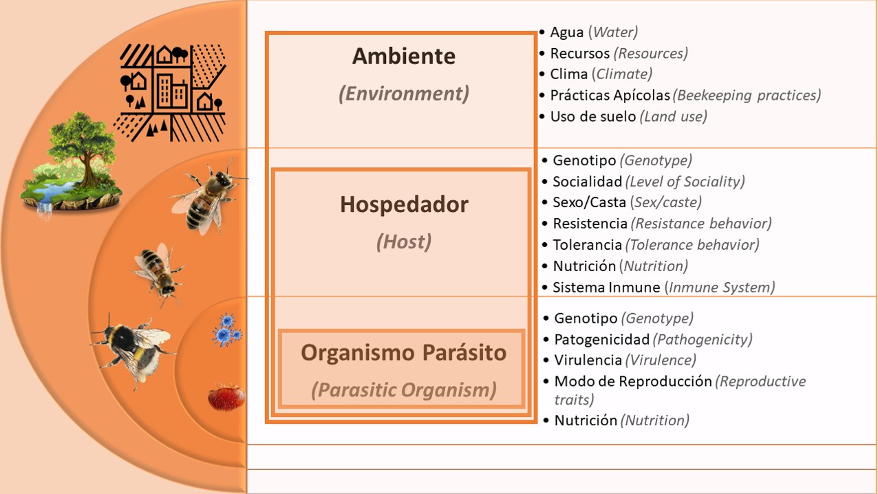 En el presente estudio los términos "organismo parásito" y "hospedador" se utilizaron bajo una visión ecológica que incluye a los organismos microparásitos y macroparásitos. Este tema se abordó utilizando a las abejas como "modelo biológico". En relación con esto, se observó cómo tanto la patogenicidad como virulencia de los organismos parásitos, dependen de un contexto (el propio organismo parásito, el hospedero, el ambiente y la interacción entre organismo parásito, hospedero y ambiente). Asimismo, se ha expuesto que el nivel de sociabilidad del hospedador permite observar cómo un organismo parásito puede afectar a su hospedador. Al mismo tiempo, destacamos el papel del medio ambiente y de la actividad humana como factores externos claves que afectan directamente al parasitismo, aumentando la virulencia de los distintos organismos sobre las abejas melíferas. Estos factores externos afectan a la nutrición y, en consecuencia, al sistema inmunitario de los individuos de A. mellifera, haciéndolos más susceptibles al efecto patogénico de diversos organismos.