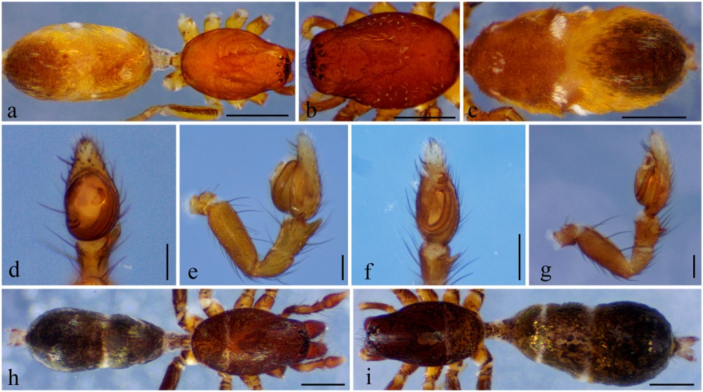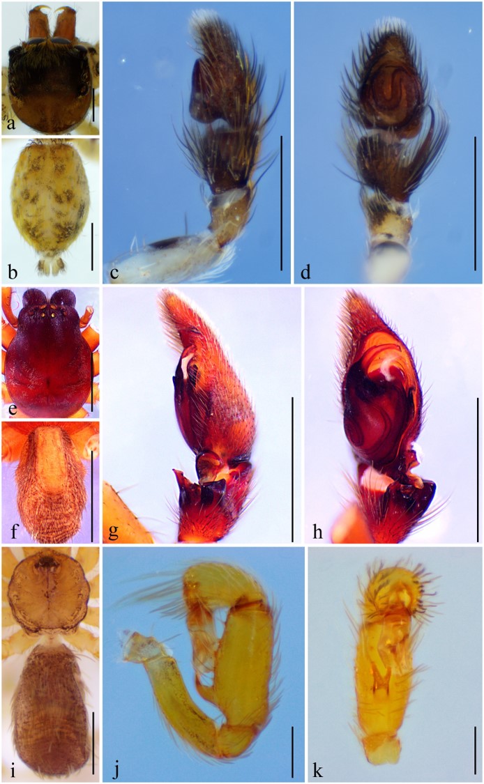 Comentarios. El género Attinella, se caracteriza por su pequeño tamaño, sin coloración marcada a excepción de A. dorsata que tiene franjas longitudinales. Attinella pertenece al clado Jollas-Tomis por presentar una apófisis retrotibial larga, delgada y paralela al eje del palpo (Maddison et al., 202Maddison et al., 2020). Las aberturas de cópula están en la parte anterior del epigineo, los conductos de cópula están fusionados inicialmente y conducen a las espermatecas, que son evidentemente pequeñas (Maddison et al., 2020: Figs. 91, 96, 101). Attinella dorsata, a diferencia de otros miembros del mismo género, presenta una delgada línea dorsal a lo largo de su cuerpo (Fig. 1a-b). Nuestros especímenes corresponden a dicha especie porque coinciden con la forma de la apófisis retrolateral tibial del pedipalpo, que se origina más basalmente que en las otras especies del género (Fig. 1c-d), compárese con Maddison et al. (2020: Fig. 94) y Gertsch & Mulaik (1936: Figs. 17, 19). La coloración del cuerpo está desvanecida, muy probablemente por el líquido preservador usado en las trampas de caída. No obstante, se distingue levemente la franja longitudinal que recorre el caparazón y el dorso del opistosoma (Fig. 1a-b). Este es el primer registro de esta especie para el país.