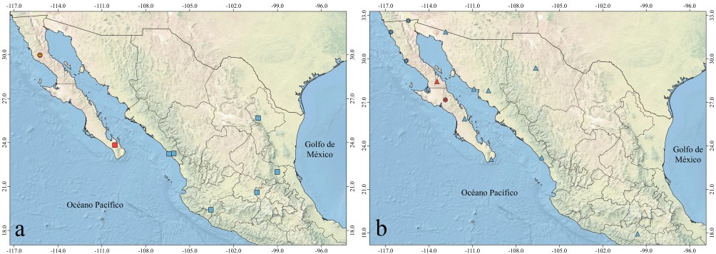 Además, a pesar de que se han realizado importantes esfuerzos por conocer la diversidad de arañas en la Península de Baja California, existen vacíos en el conocimiento sobre la distribución geográfica de la mayoría de las especies del Noroeste de México y en general del país (Jiménez, 1996; Ponce-Saavedra et al., 2023), a este tipo de vacío de información se le conoce como deficiencias Wallaceanas (del inglés Wallacean shortfall) (Hortal et al., 2015). Por lo tanto, el objetivo de este trabajo es proporcionar información relevante sobre la distribución de cinco especies de cuatro familias de arañas con base en la revisión de especímenes de la Colección de Arácnidos e Insectos del Centro de Investigaciones Biológicas del Noroeste S. C.
