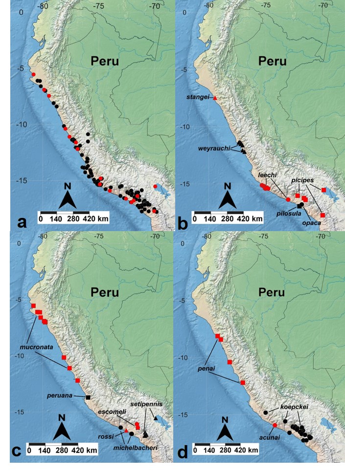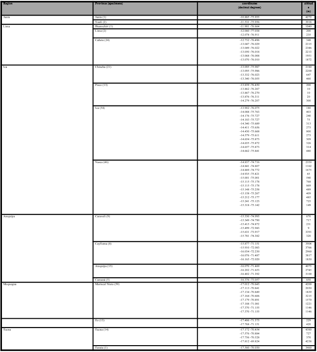 Note. Type locality offered by the author is assumed to be an imprecise midpoint between Camana and Nasca, since the road distance that separates both cities is 393 km.