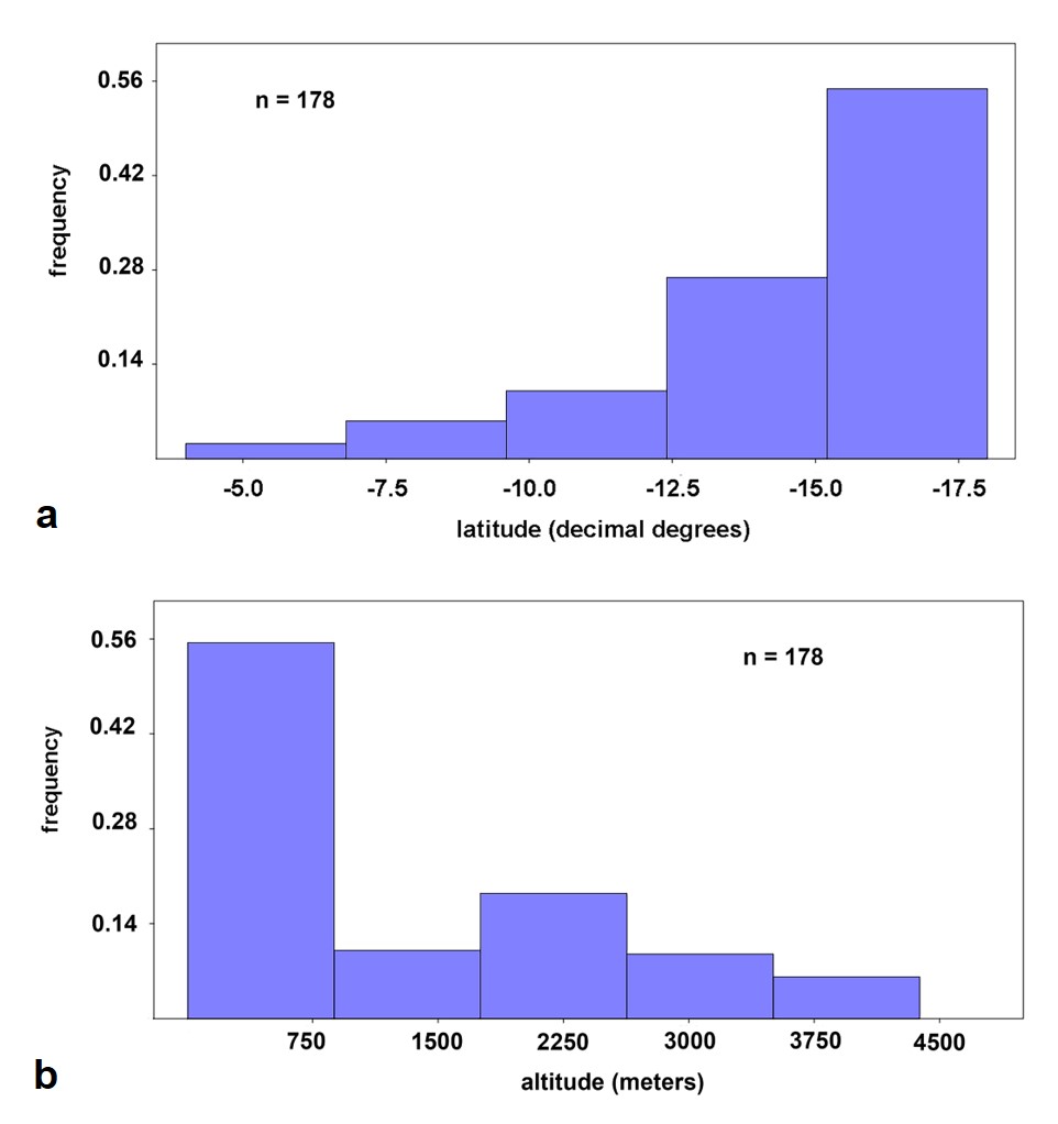 Distribution maps were elaborated using SimpleMappr (Shorthouse, 2010). Histogram plots for latitude and altitude data were elaborated with PAST software (Hammer et al., 2001).