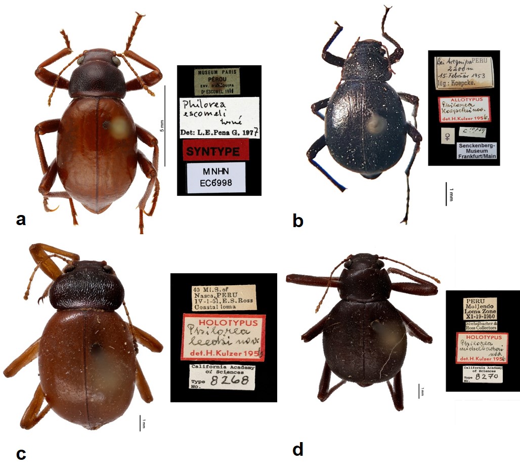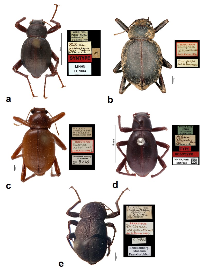 The genus Philorea Erichson, 1834 (Pimeliinae: Physogasterini) includes around 24 species distributed in localities of Peru, Bolivia and Chile (Kulzer, 1956; Peña, 1980; Vidal & Flores, 2000) within the South American transition zone (Morrone, 2015). This is the most diverse genus of the Physogasterini tribe, a set of six genera and around 69 species endemic to the arid and semi-arid regions of South America (Lacordaire, 1859; Kulzer, 1956; Ferrú & Ruiz De Gamboa, 2021).