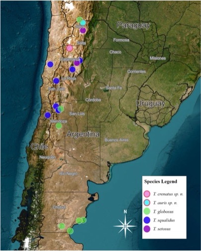 Species of Trigonogenius are endemic throughout the drier regions of mostly western South America from Ecuador through Peru, Bolivia, Chile, and into southern Argentina. The drier regions of Argentina include three deserts; part of the Atacama Desert (sensu lato) extends from Chile east into the northwestern provinces of Jujuy, Salta, and Catamarca where it is known as the Puna province [region] (Morrone, 2015). Two additional desert belts include the Monte and Patagonian Deserts that together run nearly the entire length of the country in the west and with the latter xeric region of the Patagonian province making up most of the southern 2/5 of the country (Morrone, 2015 and Arana et al., 2017 for more details on habitats and their locations). These deserts result from rain shadows created by the Andes mountains (Iglesias et al., 2011). The dominant vegetation is made up of deciduous forests and steppe in higher elevations (Paruelo et al., 1998), to desert scrub in lower elevations. Due to the aridity of these regions, biodiversity is low, but endemism is higher than the wetter surrounding areas (Roig-Juñent et al., 2001).