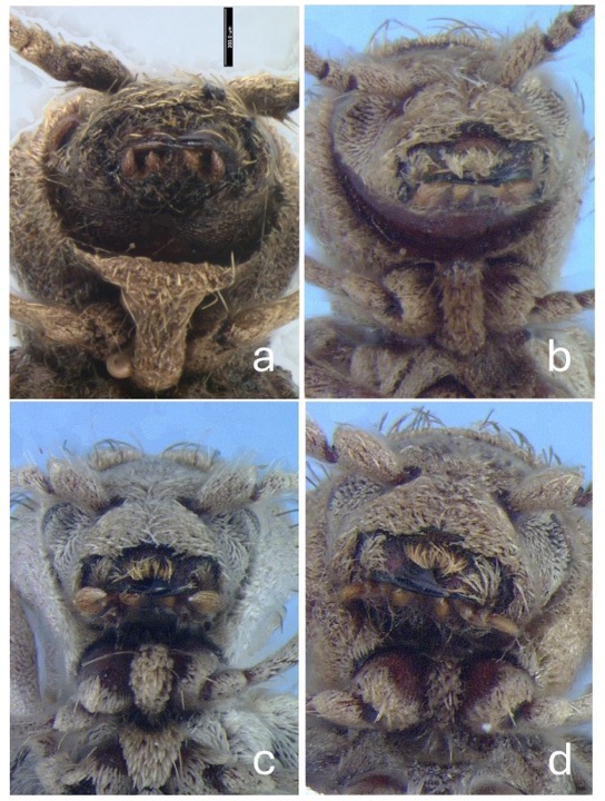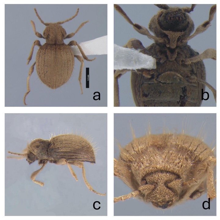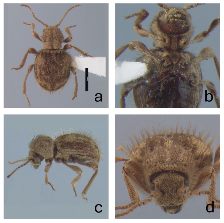 a. Dorsal habitus. b. Ventral habitus. c. Lateral view. d. Frontal view. Scale bar = 1.0 mm.