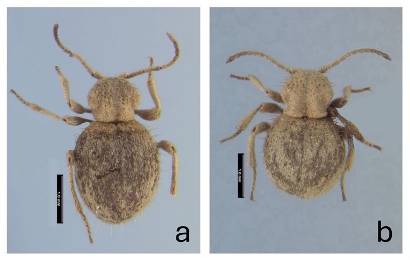 a. Trigonogenius setosus Borowski b. Trigonogenius squalidus Boieldieu (right). Scale bar = 1.0 mm.
