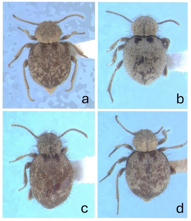 Diagnosis. This species has a very rounded body, 2.8-3.3 mm long. The eyes are surrounded by a narrow, glabrous ring. The pronotum has a relatively shallow median longitudinal groove on the basal half and lateral rounded depressions near the base. Elytra typically have four black to brown longitudinal bands at the base, varying in width, and extending approximately ¼ or less than the total elytral length, with two situated on either side of midline and two at each humeral angle. The remaining surface is variable in pattern and color.