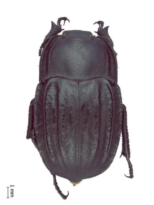 Length 13.50-15.50 mm. Body black, shiny; antennae, legs black to reddish brown. Head. Labrum with anterior margin “V”-shaped, glabrous, with abundant small punctures on all surface and big punctures (twice than the small) on anterior half separated by two to four puncture diameters; clypeus glabrous with punctures small and big (twice than the small) on all surface, separated by two to four puncture diameters; frons with punctures on all surface each bearing a short setae separated by two to six puncture diameters; epicanthus subtrapezoidal, with short setae, anterior margin oblique; eyes oval, slightly emarginate anteriorly by epicanthus, with supraocular groove continued also between frons and postgena; antennae reaching half of lateral margin of pronotum; antennomeres 1-5 longer than wide, 6-7 longer than wide or as wide as long, 8-11 wider than long, antennomere 9 wider than 10 and 11.