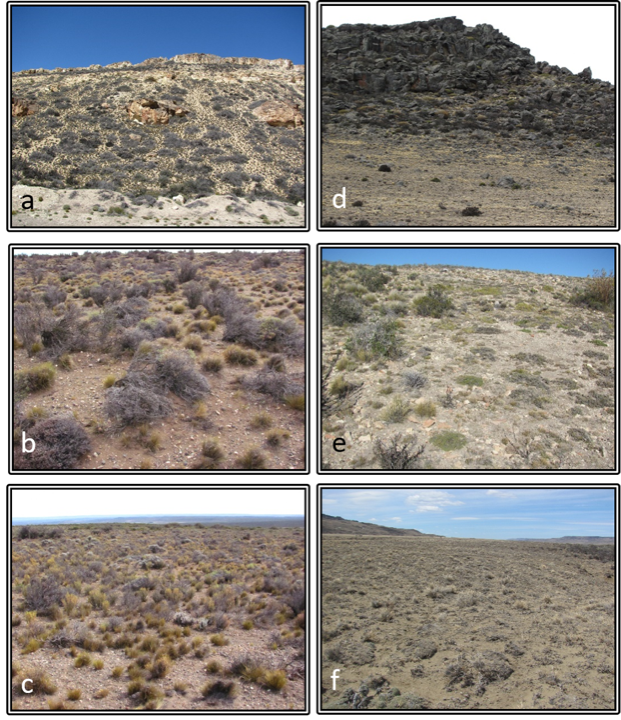 a: Typical hills with rocky outcrops covered by shrub steppes, b: rocky outcrops, c: shrub steppe in healthy condition, d: shrub steppe deteriorated by sheep overgrazing, e: grassland in healthy condition, f: grassland deteriorated by sheep overgrazing.