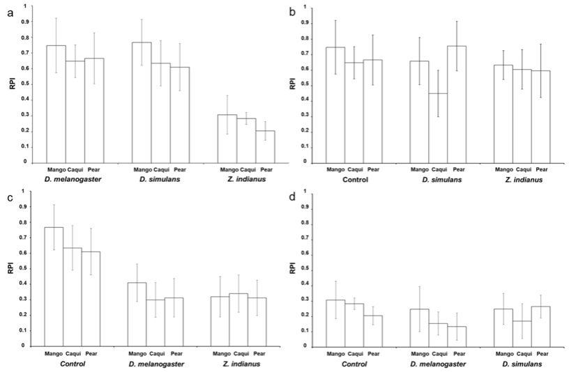 a. and for the two interspecific competition (mixed species culture) evaluated for Drosophila melanogaster. b. D. simulans. c. and Zaprionus indianus. d. reared in Mangifera indica (mango), Diospyros kaki (caqui) and Pyrus communis (pear). Control indicates the RPI value obtained for each species reared under single species culture. Error bars corresponds to standard deviations.