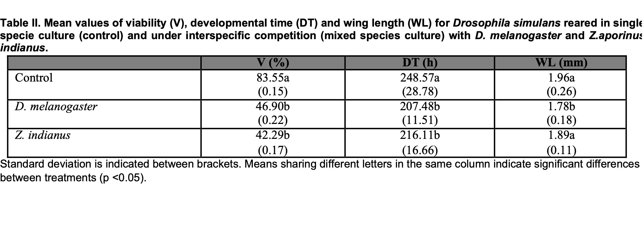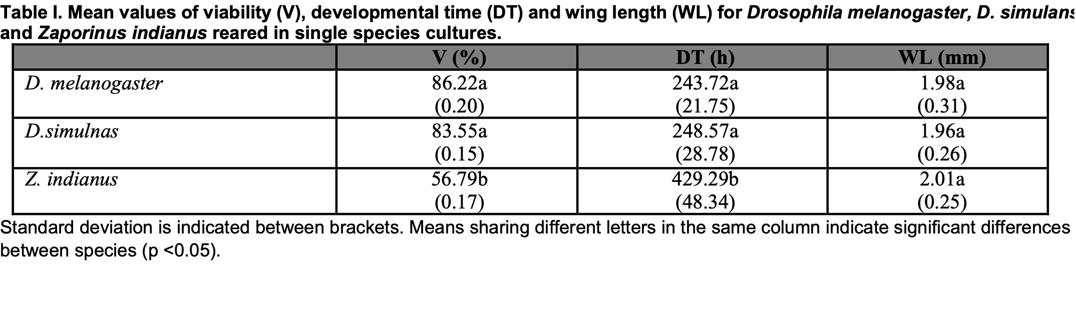 Standard deviation is indicated between brackets. Means sharing different letters in the same column indicate significant differences between species (p <0.05).